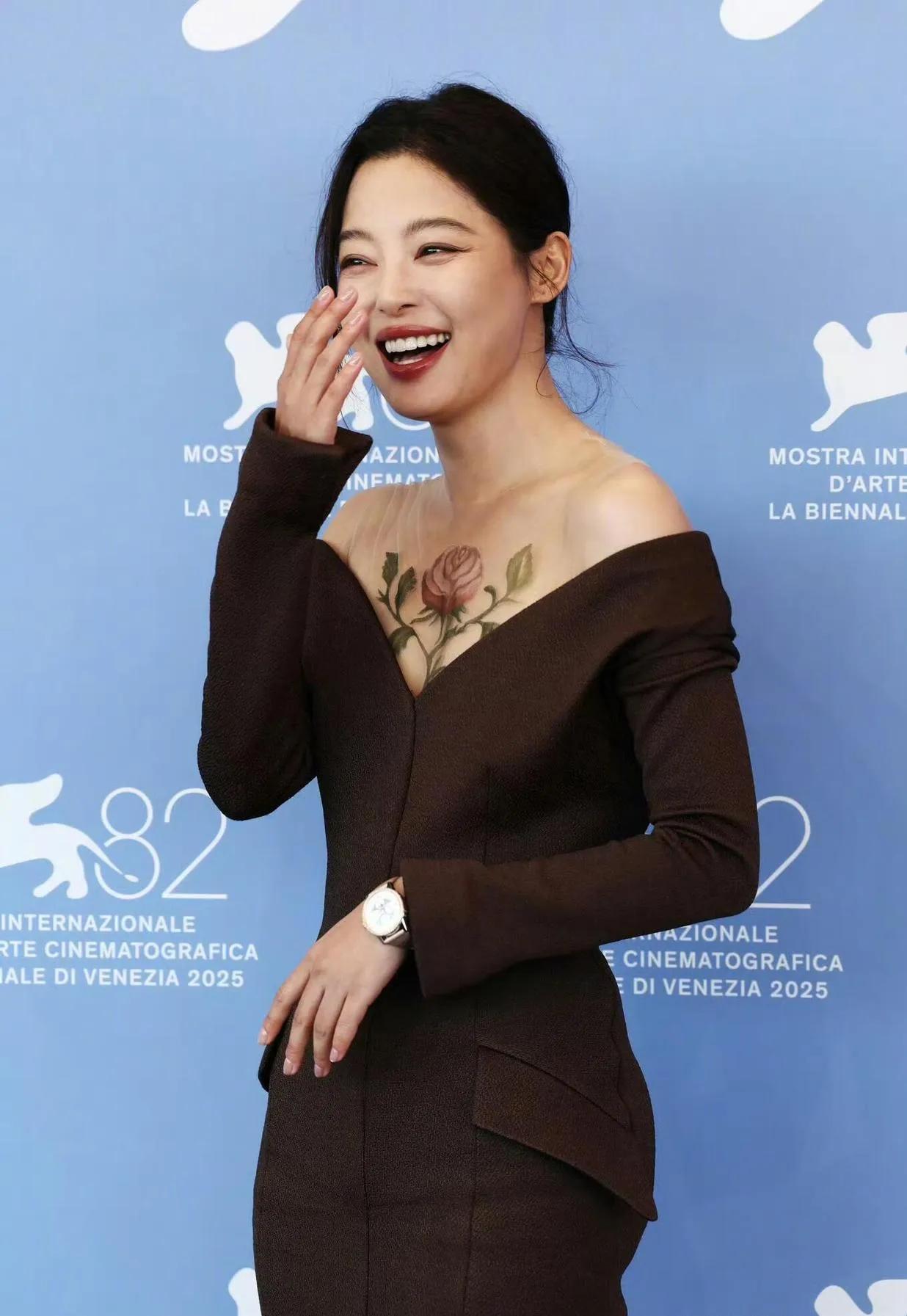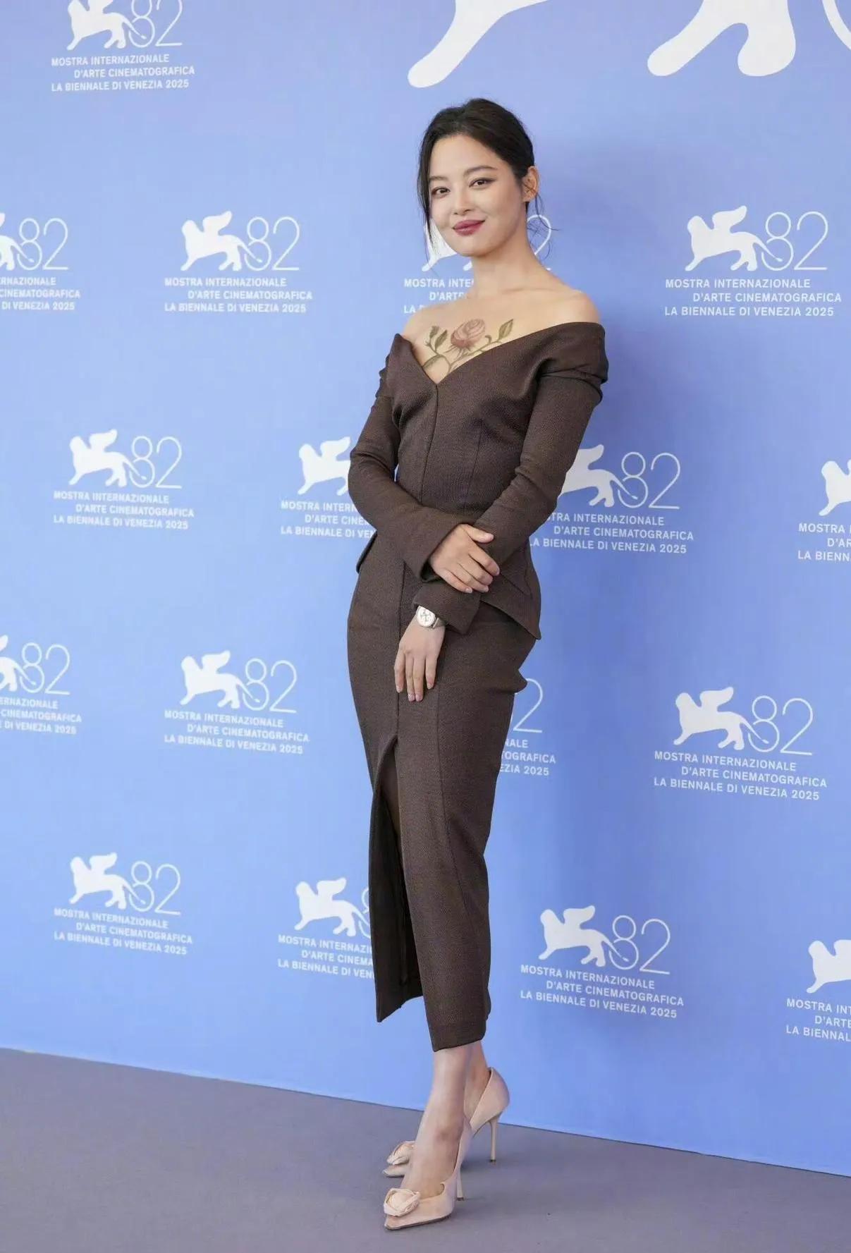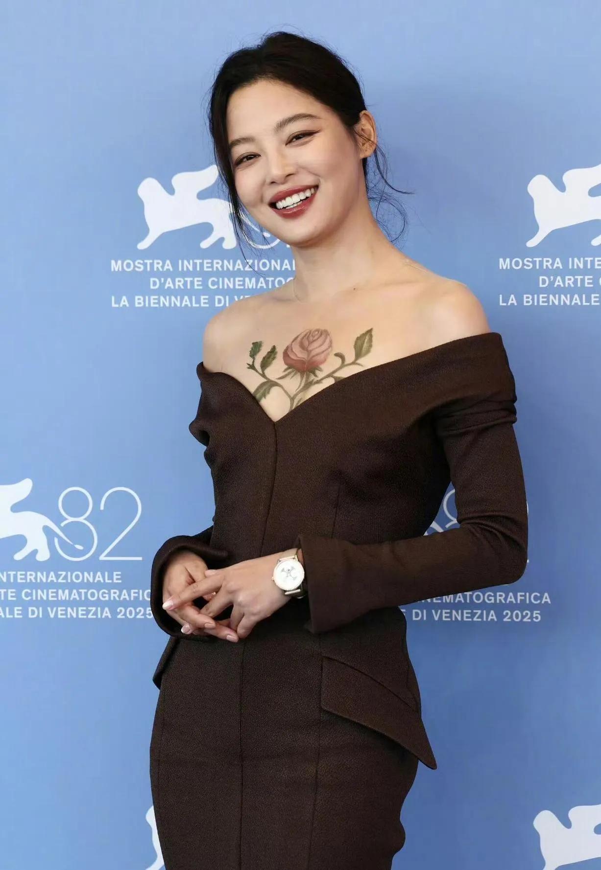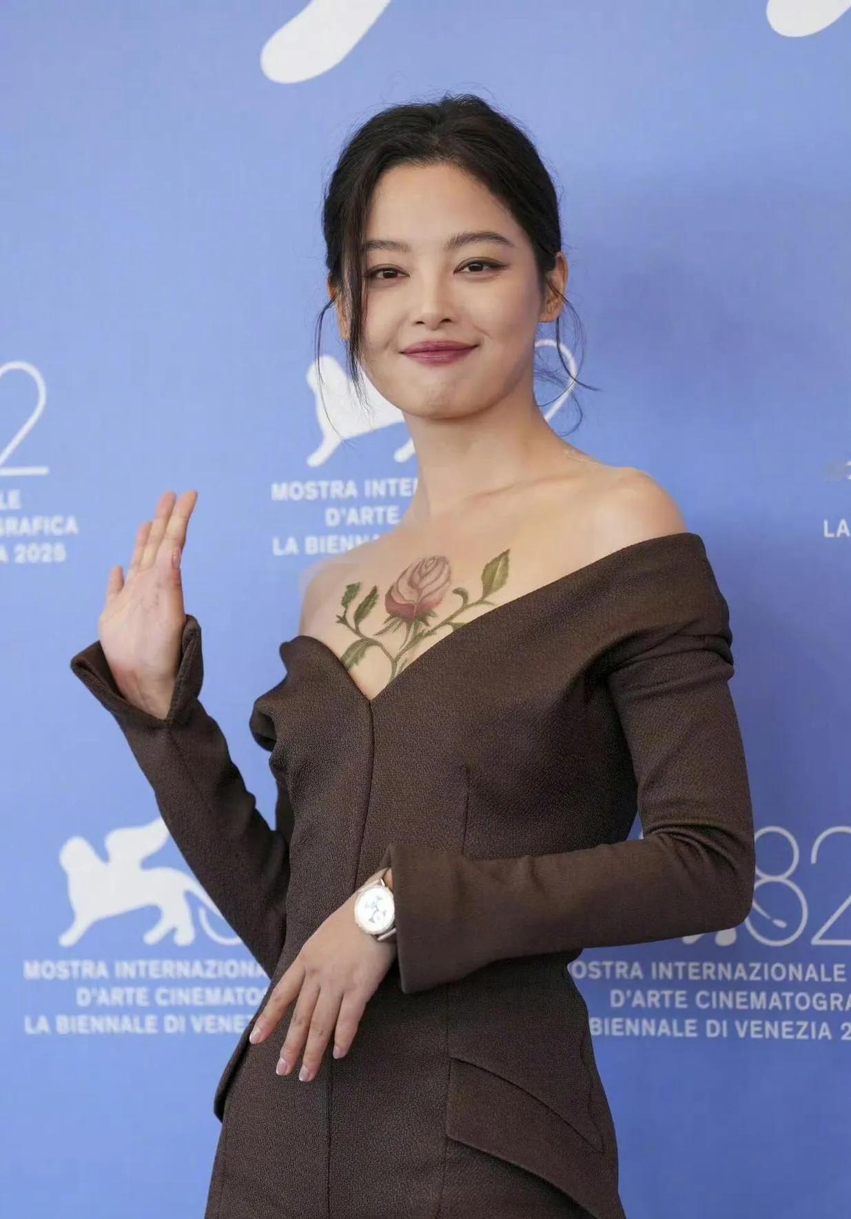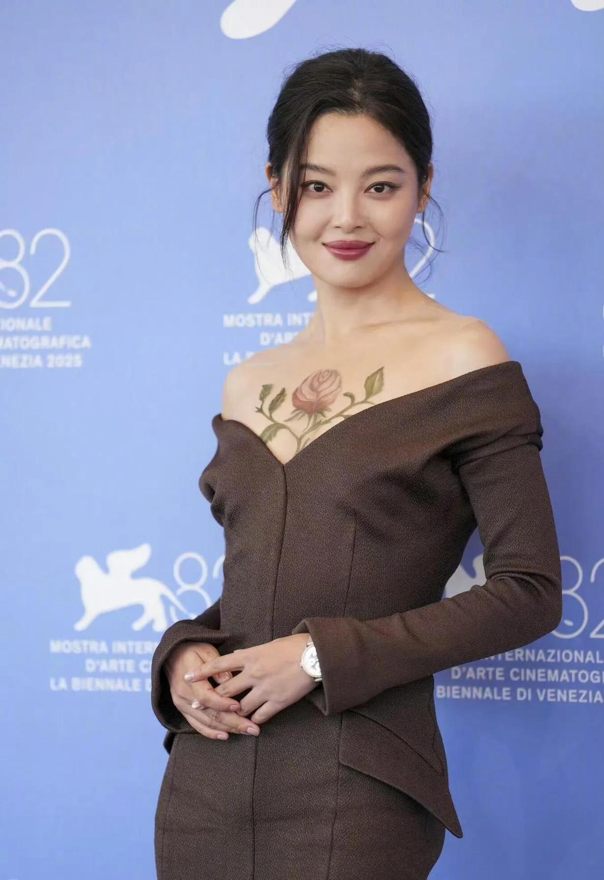 🌺辛芷蕾在威尼斯电影节这波操作,把“玫瑰藏于胸前”玩出了高级感! 一身深棕露肩礼服优雅又大胆,胸前那朵栩栩如生的玫瑰纹身(其实是美妆设计啦)直接美到失语~既有成熟女性的妩媚张力,又带着艺术感的别致细节,笑起来的时候更是明媚又抓人眼球✨ 这趟威尼斯红毯,她把“性感与优雅的平衡”拿捏得死死的,谁看了不说一句“姐姐好会穿”!