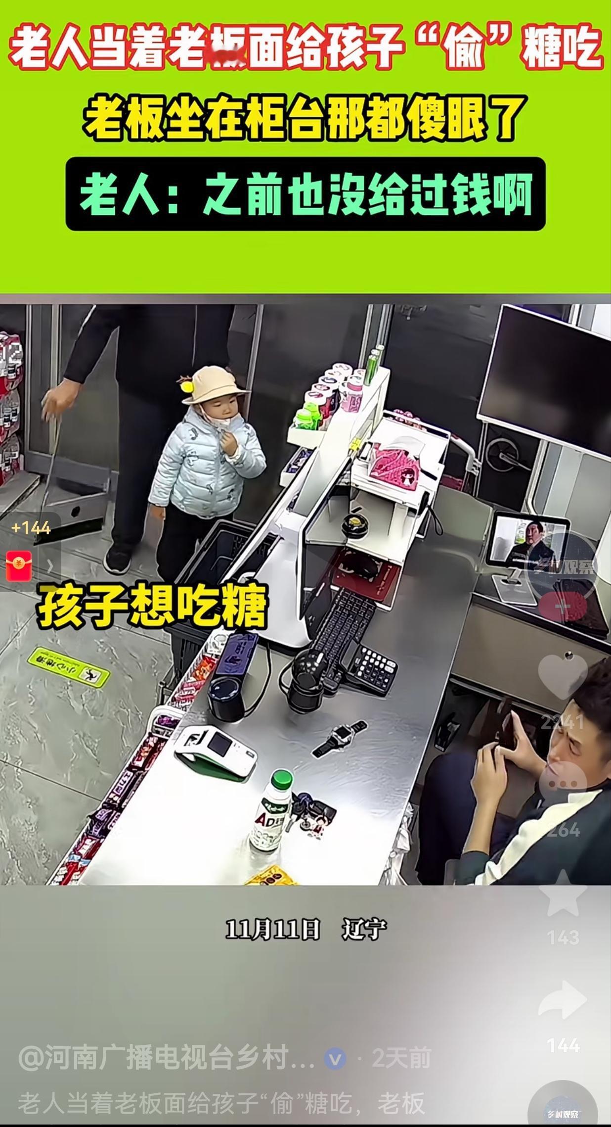 胆子挺大呀!孩子想吃糖了,老人带着孩子就走进了一家常去的超市,你以为他是给孩子买糖吃吗?他的骚操作惊呆了众人。 老人走到前台,当着老板的面,直接偷了一颗糖递给了孩子。 然后,既没有给钱,也没有打声招呼,转身就离开了! 老板看到后,直接傻眼了!立刻站起身来,追到了店外,大声喊道:“你拿糖为什么不知道付钱呢?” 老人面对质疑声,领着孩子走到了老板的面前,声称之前在店里购买过很多东西,以前都是免费给的,怎么现在不能免费给一个吗? 老板无奈地说:“我给是我给,但是,你也不能当着我的面拿着就走呀!” 网友看到后评论说,所以,做生意千万不能免费给人家东西,因为,有的人觉得你应该免费。 还有的网友说,让这样的爷爷带孩子,孩子的父母不怕孩子被教育坏了? 按理说,一颗糖不值什么钱?给不给钱都无所谓,但是,就算你不想给,你也要跟老板说清楚呀!为什么拿着就走呢?这跟盗窃有什么区别呢? 人家免费送给你吃,那没有一点问题。关键是人家这不是没有送给你呀! 而且,你当着孩子的面,直接这样做,就不怕给孩子带坏了吗?孩子年纪小,不懂事,模仿能力特别强,万一真的向你学习,你不是造孽了吗?所以说,勿以善小而不为,勿以恶小而为之。 大家觉得呢?欢迎大家评论区讨论留言。