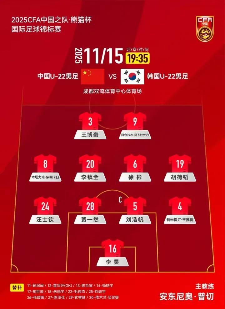 韩国队也没有那么强大,上半场双方握手言和,中国队0比0韩国队,沉闷的上半场,双方都打得比较稳,都是防守反击,安东尼奥今天的首发阵型和上一场几乎一模一样,就换了一个门将李昊上场,还是532阵容,王伯豪和拜合拉木继续打双前锋,上半场双方机会都不多,中国队制造了两次威胁,可惜未能破门,韩国队就最后一分钟制造了一次威胁,半场结束,双方0比0打平。 看样子,双方主教练都在赌下半场,安东尼奥下半场大概率要派全运会队员出场了,韩国队也会派上杀手锏,希望下半场双方上演进球大战,韩国队也不怎么样,中国队争取复仇韩国,中国队加油!