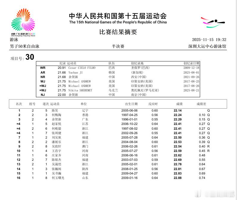 全运男50自半决赛辽宁小将创国内历史前五佳绩 潘展乐惊险挤上决赛末班车11月15日晚,全运会游泳大项结束男子50米自由泳半决赛争夺。20岁的辽宁选手陈昊以22秒14的个人最佳战绩获得半决赛第一。今年全国冠军赛拿下50自冠军的浙江选手潘展乐,半决赛发挥不佳,仅以22秒53排名第八位,正好挤上决赛末班车。第一组,江苏选手赵家悦和浙江选手张周健以22秒41并列第一。全国纪录保持者、广东选手余贺新和本届全运百自冠军潘展乐在第二组出场。这场较量的结果有点出人预料。余贺新和香港队的何甄陶在比赛中大部分时间里保持领先,但第五道的辽宁选手陈昊在冲刺时勇猛超越!结果是陈昊以22秒14的优异成绩拿到小组第一,该成绩在中国男子50米历史排行榜上排在第五位,仅次于余贺新、宁泽涛、潘展乐和王长浩。何甄陶22秒24获小组第二,余贺新22秒29第三。第二组小组前三名也是半决赛前三。第二道的潘展乐本场竞争力不强,全程落后于领先选手。最后以22秒53排名第五。总排名潘展乐正好第八名,惊险进入决赛。陈昊在今年全国冠军赛上已经有22秒27的出色发挥,并最终获得季军。本届全运会或许能见证中国男子50自又一位21秒级选手的诞生。