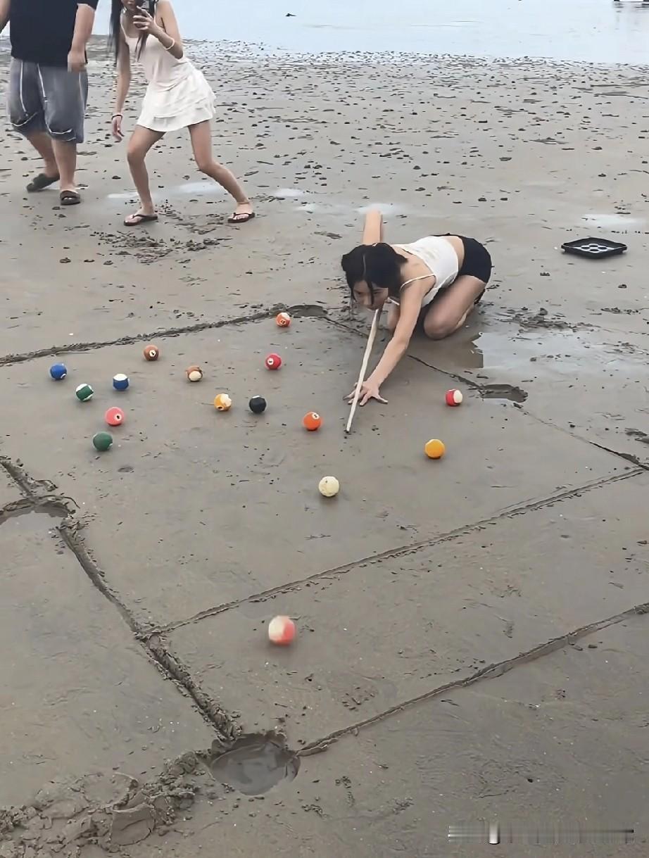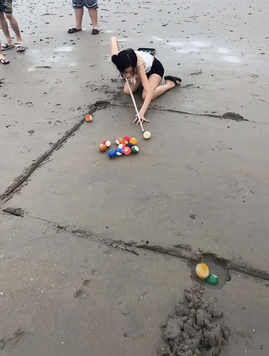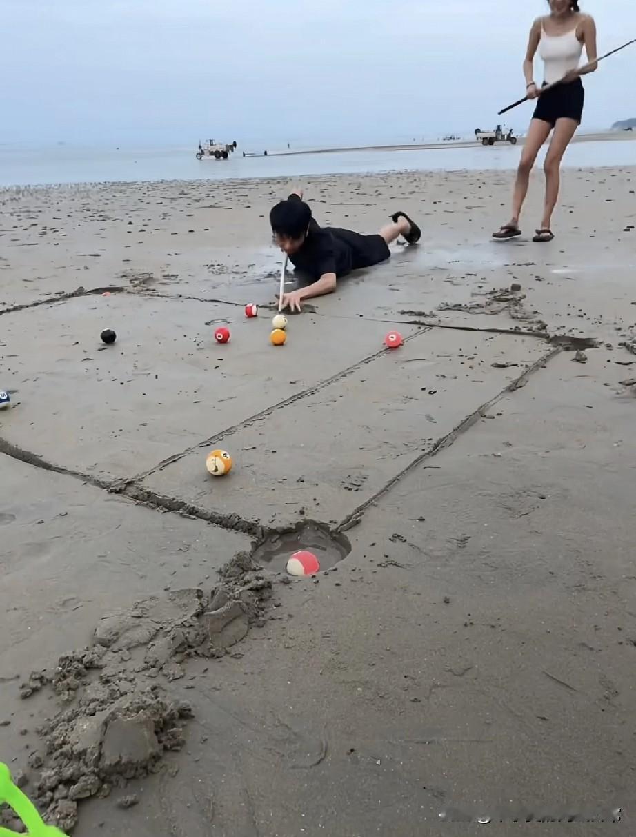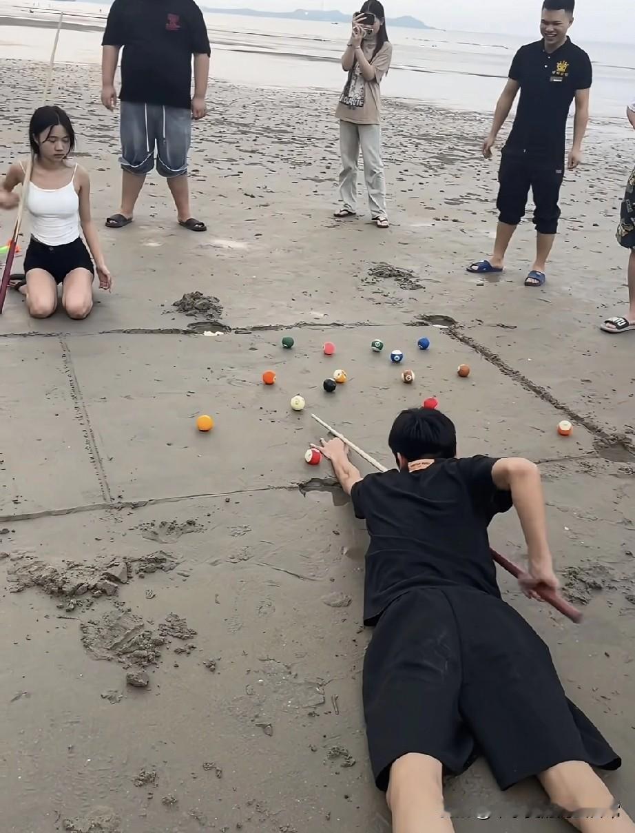 丁俊晖来了这片沙滩,怕是也得被虐到怀疑人生! 你看这沙滩台球:拿树枝当球杆,拿沙坑当球袋,刚瞄准的球能顺着沙沟溜出八丈远,杆头戳进沙子里是常事,连趴着击球都能让母球原地“卡壳”。平时在球房算角度、控力度的大神,到这儿全成“盲打选手”——球往哪滚全看沙子心情。 妹子跪着打、小哥趴着捅,球要么钻沙坑要么撞“水洼陷阱”,一群人笑得直不起腰,这哪是打球,分明是沙滩版“随机抽疯大赛”! 不过话说回来:这沙滩台球到底算不算“摆烂式快乐”?要是丁俊晖真来,靠运气赢了算本事不