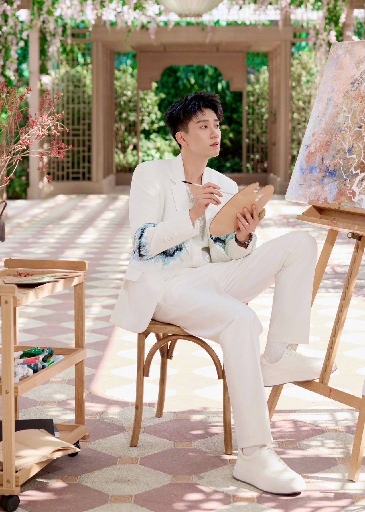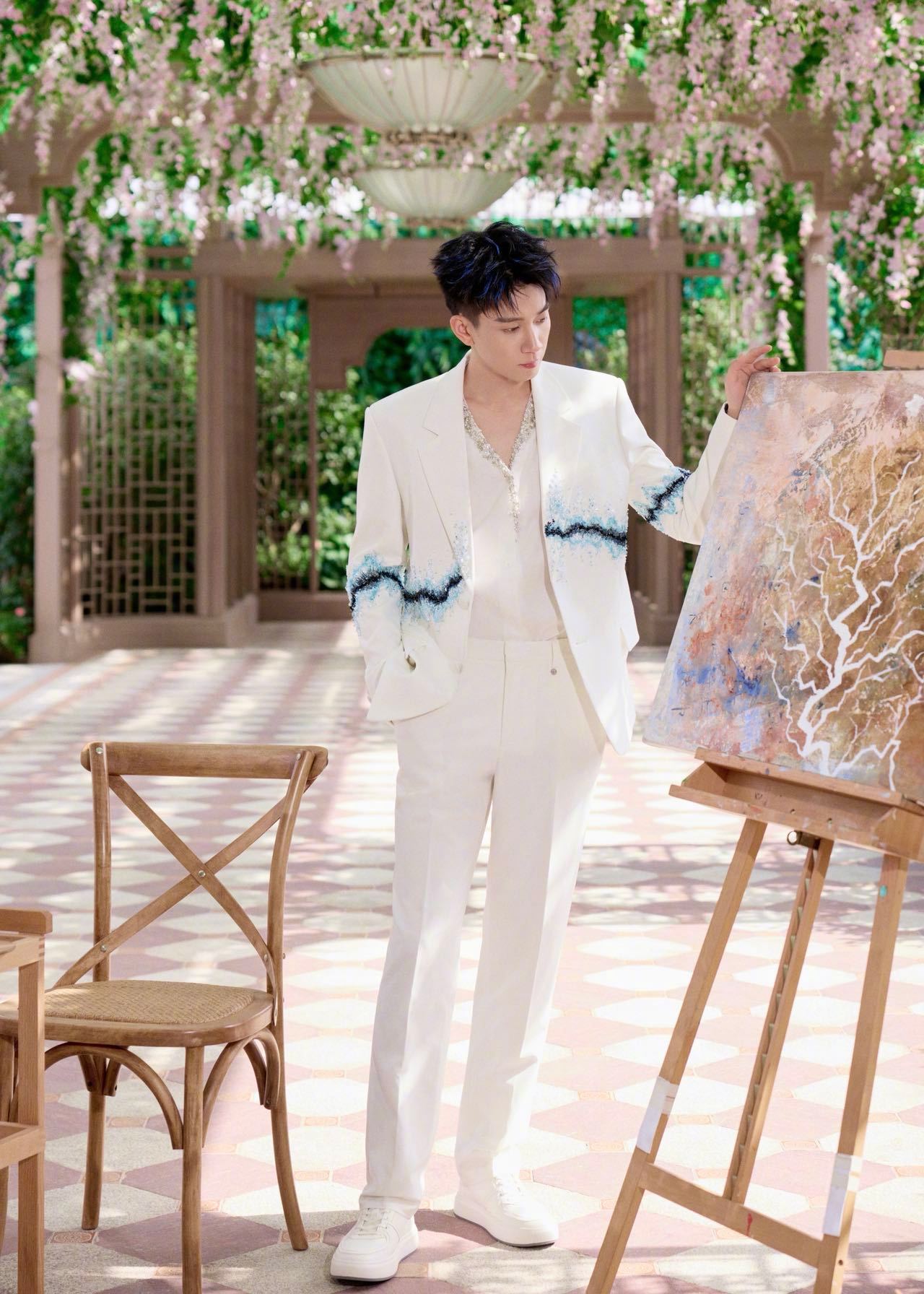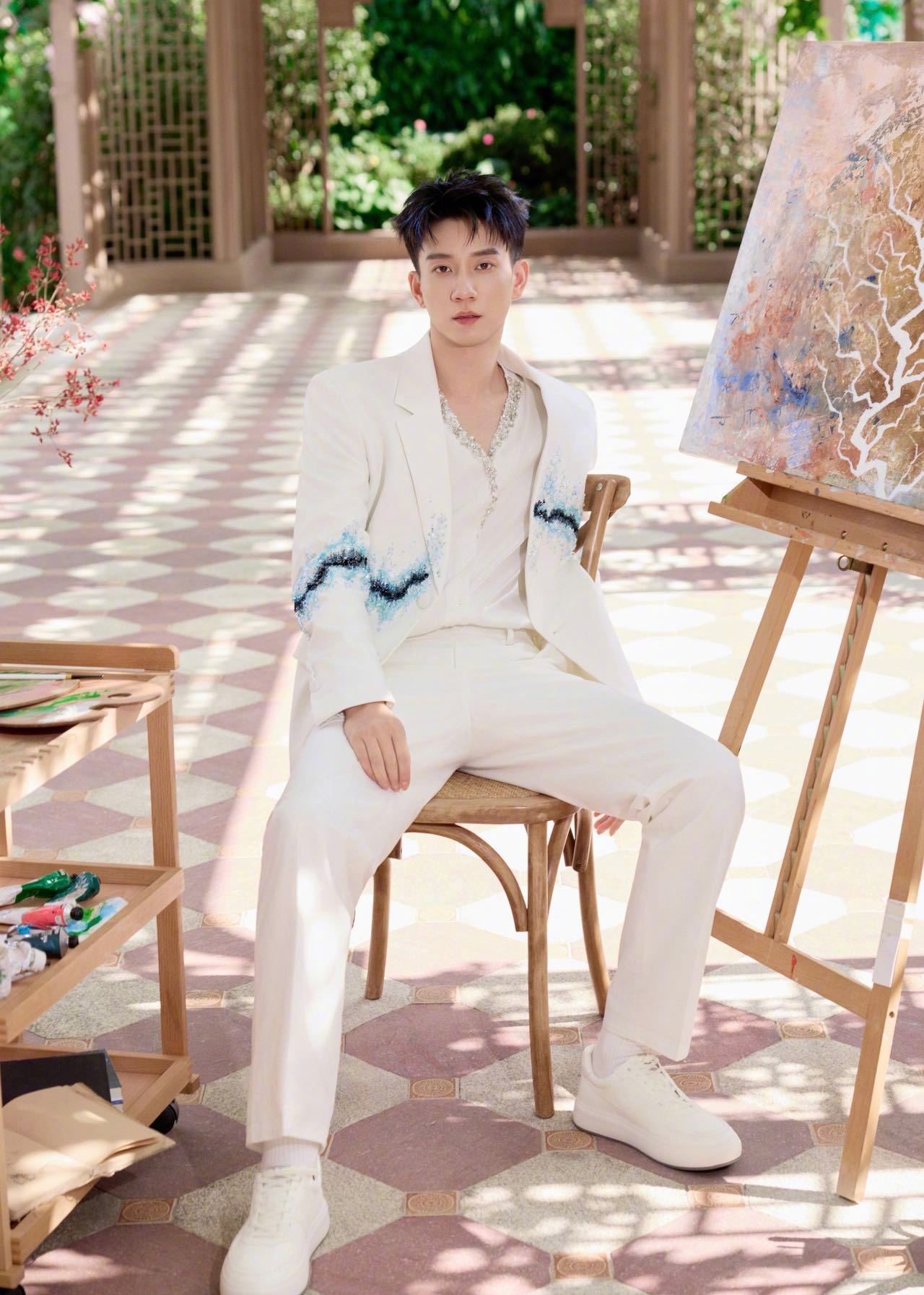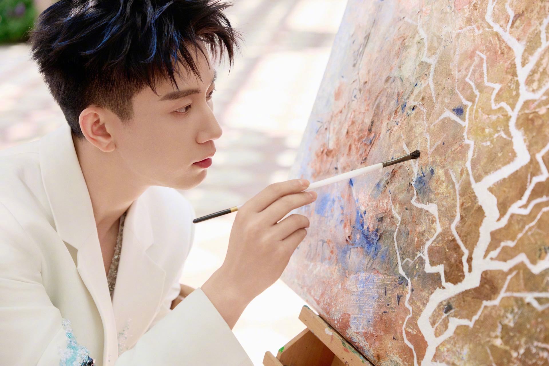 王子奇今天站在那就是白马王子本子吧!身穿一身白色西装,腰间点缀似银河🌌,好帅的蓝色挑染王子!