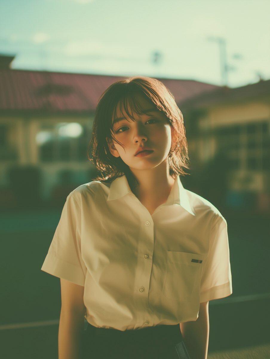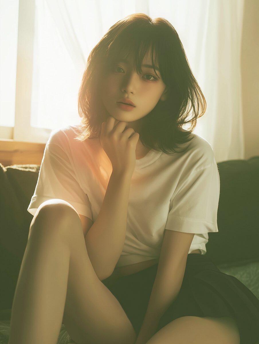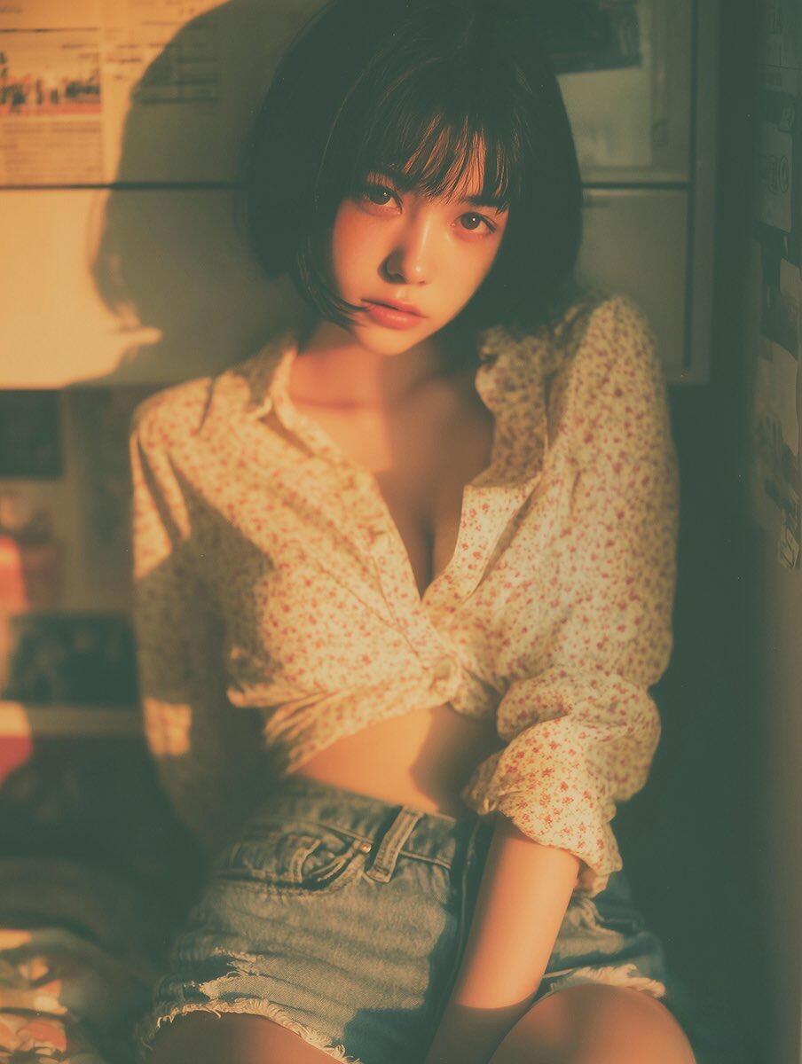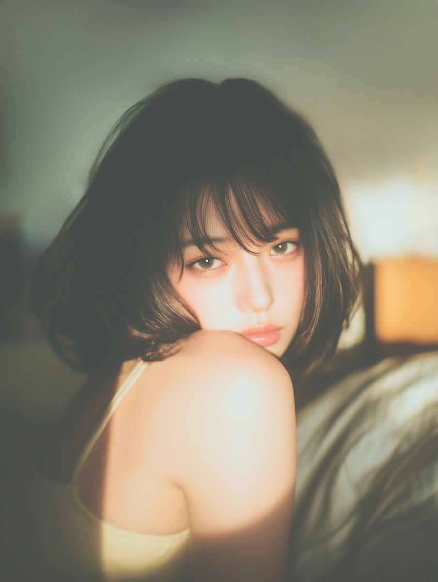 窗帘没拉严,夕阳就从缝里溜进来,裹着她肩颈的弧度,像块融化的黄油。 吊带是浅米色,和床单的绒面揉在一起,发尾蜷在耳后,连唇色都淡得像加了层雾。她没看镜头,视线落在床沿那盏没亮的灯上,睫毛垂着,把情绪藏在半明半暗里。 这种“不聚焦”的温柔最戳人——不是用力的美,是松弛下来的松弛:肩膀垮着,头发乱着,连光都懒懒散散,却把“舒服”两个字揉进了每寸光影里。 原来最好的写真,是让镜头变成房间里的另一缕风,轻轻碰了碰她的情绪。