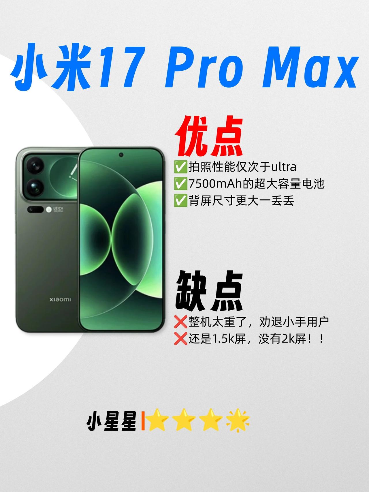小米17优缺点,一篇文章盘清楚!纠结小米17系列的宝子,今天给大家一篇文章搞懂!!✌️ 小米17 标准版(相对推荐) 优点: · 小尺寸直屏手感绝了!一手掌握的感觉太舒服了 · 7000mAh超大电池,续航焦虑?不存在的! · 逆光拍摄表现超棒,光影再乱也能出大片感 缺点: · 屏幕是1.5K分辨率,和K80比稍微有点差距 · 影像硬件升级不大,对拍照有极高要求的可能会觉得进步有限 · 没有背屏设计,外观辨识度稍弱一些 小米17 Pro(比较不推荐) 优点: · 拍照能力大升级!仅次于Ultra,日常完全够用 · 有酷炫的背屏设计(虽然比Pro Max小一丢丢) · 缺点: · · 依旧是1.5K屏,没有上2K有点小遗憾 · 有用户反馈背屏操作偶尔不太灵敏 · 用背屏自拍时预览人脸会有点模糊,主要起构图作用 小米17 Pro Max(预算高可以冲) 优点: · 拍照性能绝对是第一梯队,实力超强!👑 · 7500mAh超大电池,重度使用也无压力 · 背屏尺寸是三款中最大的,视觉冲击力拉满 缺点: · 整机非常重!名副其实的“半斤机”,小手用户直接劝退 · 还是1.5K屏!!都顶配了不上2K,这点真的想吐槽