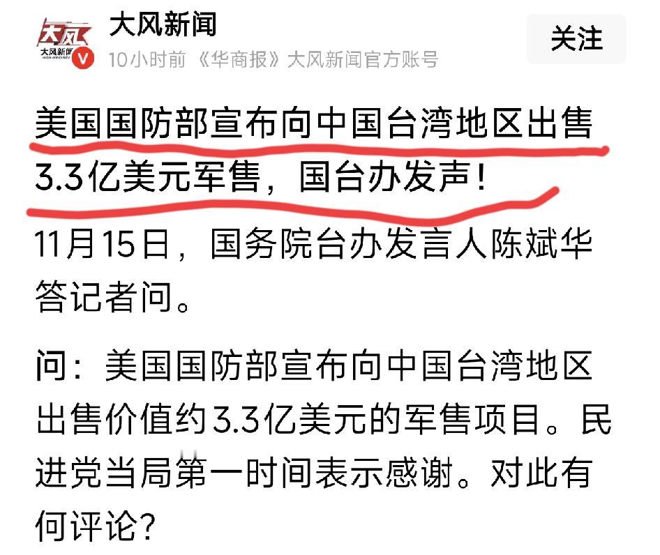 您知道吗?美国给台湾卖武器,已经偷偷干了46年!从1979年中美建交那年算起,前前后后卖了100多回,总金额飙到700多亿美金——这钱够在台湾建200所小学,修10条环岛高速,可全填了美国军火商的腰包! 就拿最近11月15号这单说,美国国防部又宣布给中国台湾省卖3.3亿美金的“先进战术数据链系统”和雷达配件。听着玄乎?说白了就是给台军装个“美台联合作战群聊”,让美军能实时指挥台军——这不是明摆着把台湾绑上美国的战车吗? 咱再扒拉扒拉历史账:2020年特朗普下台前,急着批了6.2亿美金升级“爱国者-3”导弹;2022年拜登任上,又塞了11亿的“鱼叉”反舰导弹;2024年更绝,连“毒刺”防空导弹和无人机零件都安排上了。您品,从防空到反舰再到情报共享,美国把台湾当“试验场”还是“提线木偶”? 最扎心的是台湾老百姓。陈斌华发言人说得直白:“赖清德当局拿着老百姓的养老金、加班费去买武器,把岛变成‘火药桶’,最后炸的是谁家娃?”您算笔账,这些年台湾买武器的钱,够给每个老人每月多涨2000块养老金,够给偏乡盖50所医院——可现在呢?全打了水漂! 有人问:“美国为啥非卖不可?”我给您透个底——洛克希德·马丁、雷神这些军火巨头,每年给美国政客送的“政治献金”超百亿美金!对台军售就是他们的“摇钱树”,政客们拿了钱,自然睁只眼闭只眼签合同。可苦了台湾,当“冤大头”不说,还把自己架在火上烤。 咱再往大了说,一个中国原则是中美关系的根基,写进宪法、写进三个联合公报,连“八·一七”公报都白纸黑字写着“美国逐步减少对台军售”。可美国倒好,嘴上说遵守,实际年年加码——这不是“签了合同还撕毁”吗? 最后想跟大家掏心窝:台湾问题是中国人自己的家务事,容不得外人插手。美国卖的不是武器,是挑事的导火索;赖清德买的不是安全,是把台湾往深渊推的“催命符”。咱们普通人能做啥?记住一个中国原则,对“台独”言论说不,就是在给国家撑腰! 您说,美国这“台独”保护伞,还能撑多久?赖清德还要把台湾老百姓绑上“台独”战车到啥时候?评论区聊聊您的看法~ 信息来源:国台办官网《发言人就美国对台军售答记者问》(2025年11月15日实录)、央视新闻《美国对台军售累计超700亿美元,中方:坚决反对分裂行径》(2024年专题报道)、外交部官网《中美三个联合公报》原文摘录。美售台湾武器 美国售台武器 对台出售武器 美俄军火市场 美国武器出口 美方武器 对台军火