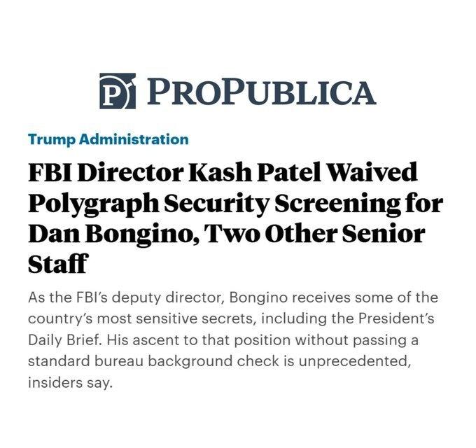 FBI局长卡什·帕特尔(Kash Patel)拒绝就“多名雇员未通过测谎”的举报做出正面回应。参议院司法委员会9月听证会上,民主党籍资深议员迪克·德宾当面询问“是否有人因测谎结果不合格而被您或司法部长豁免”,帕特尔只回答“我需要再回复您”,至今未向委员会提供任何说明。 根据ProPublica等媒体报道,被豁免的至少包括: - 副局长丹·邦吉诺(Dan Bongino) - 国会联络官马歇尔·耶茨(Marshall Yates) - 局长个人助理妮科尔·拉克(Nicole Rucker) 三人要么未接受测谎,要么结果被评估为“存疑”或“不合格”,却通过帕特尔亲自签署的豁免书,照样获得最高机密级别通行证。FBI官方声明否认“有人测谎失败”,但拒绝公布豁免细节,也未回应司法部督察长收到的内部投诉。因此,外界至今仍无法得知具体失败人数与原因,帕特尔本人则持续以“人事保密”为由保持沉默。