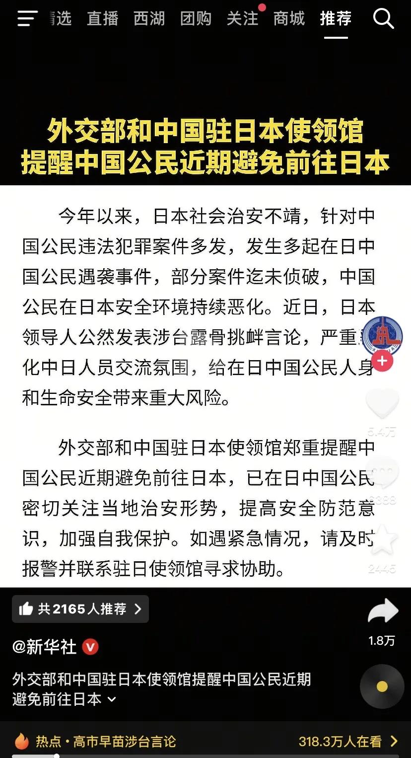不要去日本,不要去日本,不要去日本!重要的事情说三遍。 大家可能已经看到了新闻,11月14日外交部和中国驻日本使领馆联合发布的郑重提醒,明确告知中国公民近期避免前往日本——这绝非普通的旅行提示,而是基于当前双重高危风险的必要警示,背后藏着实实在在的安全隐患。今年以来,日本社会治安持续不靖,针对中国公民的违法犯罪案件呈“爆发式增长”,多起袭击、抢劫事件频发,更让人揪心的是,部分恶性案件至今未侦破,在日中国公民的安全环境早已今非昔比。 其实之前这样的事情就发生过。就在2024年7月,一名中国游客在大阪街头凌晨散步时,突然被陌生男子持刀刺伤左腕,对方还用英文索要钱财,游客夫妇奋力抵抗并求助便利店才得以脱身,虽然嫌犯后续被捕,但这场无妄之灾给当事人留下了深深的心理阴影 。而进入2025年,类似的恶性案件更是有增无减:9月福冈的中国留学生遭遇持刀抢劫,10月东京池袋的中国游客被团伙诈骗,仅公开记录的针对性袭击、围殴等暴力案件就超27起,涉及东京、大阪、福冈等多个核心城市及华人聚集区。更让人无奈的是日本警方的低效应对,不少受害者遇袭后,警方仅做笔录便无后续,取证不足、调查搁置的情况屡见不鲜,一名在东京的中国留学生就曾透露,自己深夜遭围堵殴打后,案件至今没有进展,“感觉在这里连基本的人身安全都得不到保障”。据统计,今年涉及中国公民的各类违法犯罪案件较往年同期上升近30%,社会治安漏洞和外国人安全保护机制的缺失,让在日华人时刻面临未知风险。 雪上加霜的是,近日日本领导人公然发表涉台露骨挑衅言论,声称“台湾有事即日本存亡危机事态”,甚至暗示可能武力介入台海,严重违背中日四个政治文件精神,突破一个中国原则底线。这种政治挑衅不仅破坏了两国互信,更直接毒化了民间交流氛围,近期已有在日中国公民反映,街头针对华人的言语挑衅明显增多,部分商铺甚至出现“拒绝接待中国顾客”的情况,无形中将中国公民置于更危险的境地。外交部明确指出,这种挑衅行为“给在日中国公民人身和生命安全带来重大风险”,这也是此次发布严厉提醒的关键原因之一 。 面对如此严峻的形势,官方早已给出明确指引:计划赴日的游客、留学生及商务人士,应理性评估风险,近期尽量避免前往;已在日的中国公民,要密切关注当地治安形势,避免夜间单独出行、远离案件高发区域,减少不必要外出。值得一提的是,国航、南航、东航等多家航空公司也迅速响应,即日起至12月31日的日本航线机票均可免费退改,这无疑是最务实的风险规避支持。如果遇到紧急情况,务必第一时间拨打日本110报警电话、119急救电话,或联系中国驻日使领馆24小时领事保护热线,祖国永远是海外公民最坚实的后盾 。 身边不少朋友原本计划年底去日本旅游,看到官方提醒后都果断取消了行程。有人说:“旅游是为了放松,可不是去赌安全,官方都明确警示了,没必要拿自己的安危冒险。”也有人感慨:“以前觉得日本治安不错,没想到现在针对中国公民的案件这么多,还有政治因素添乱,确实不能掉以轻心。”毕竟,无论是旅游、求学还是工作,安全永远是第一位的,没有什么比人身安全更重要。 此次外交部的严厉提醒,既是对海外公民安全的负责任守护,也是对当前复杂局势的客观研判。那些觉得“只是个别案件”“没必要大惊小怪”的想法,其实是对自身安全的漠视。在双重风险叠加的当下,“避免前往”不是恐慌,而是最理性的选择。 各位读者你们怎么看?你或身边人有近期赴日的计划吗?面对官方的安全提醒,你会选择调整行程吗?欢迎在评论区讨论。