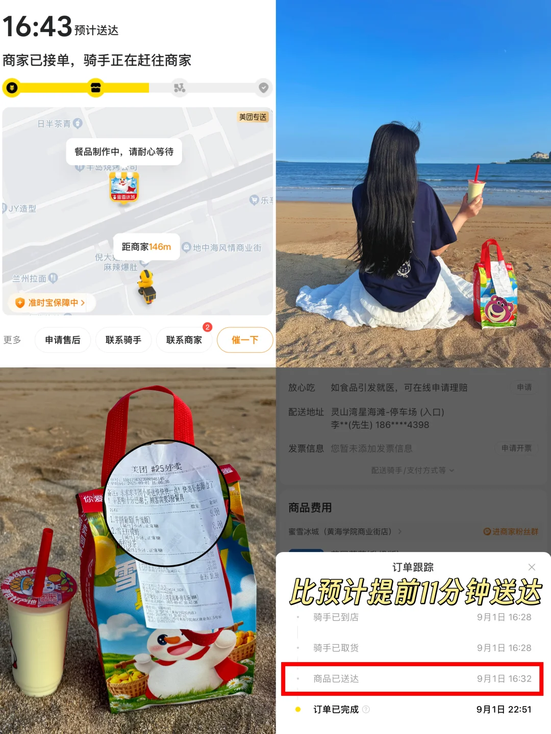 在海边打卡渴的快冒烟啦 附近又买不到水的感觉谁懂啊❗️还好有我的旅行好搭子「美团外卖」 怒点了好几杯快乐水 备注加急真的提前11分钟送达了‼️也是体验到了大热天一杯冰水的救赎感‼️不愧是我的黄帽子小哥 速度就是杠杠滴👍