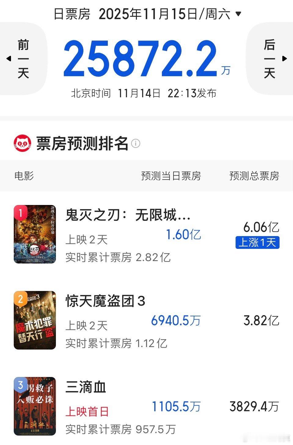 《鬼灭之刃》《惊天魔盗团3》《三滴血》三部新片的预测票房都有下调。《鬼灭之刃》从6.06亿下调至5.85亿《惊天魔盗团》从3.82亿下调至3.03亿。下调幅度有点大。《三滴血》也有下调。从3829万下调至3545万。