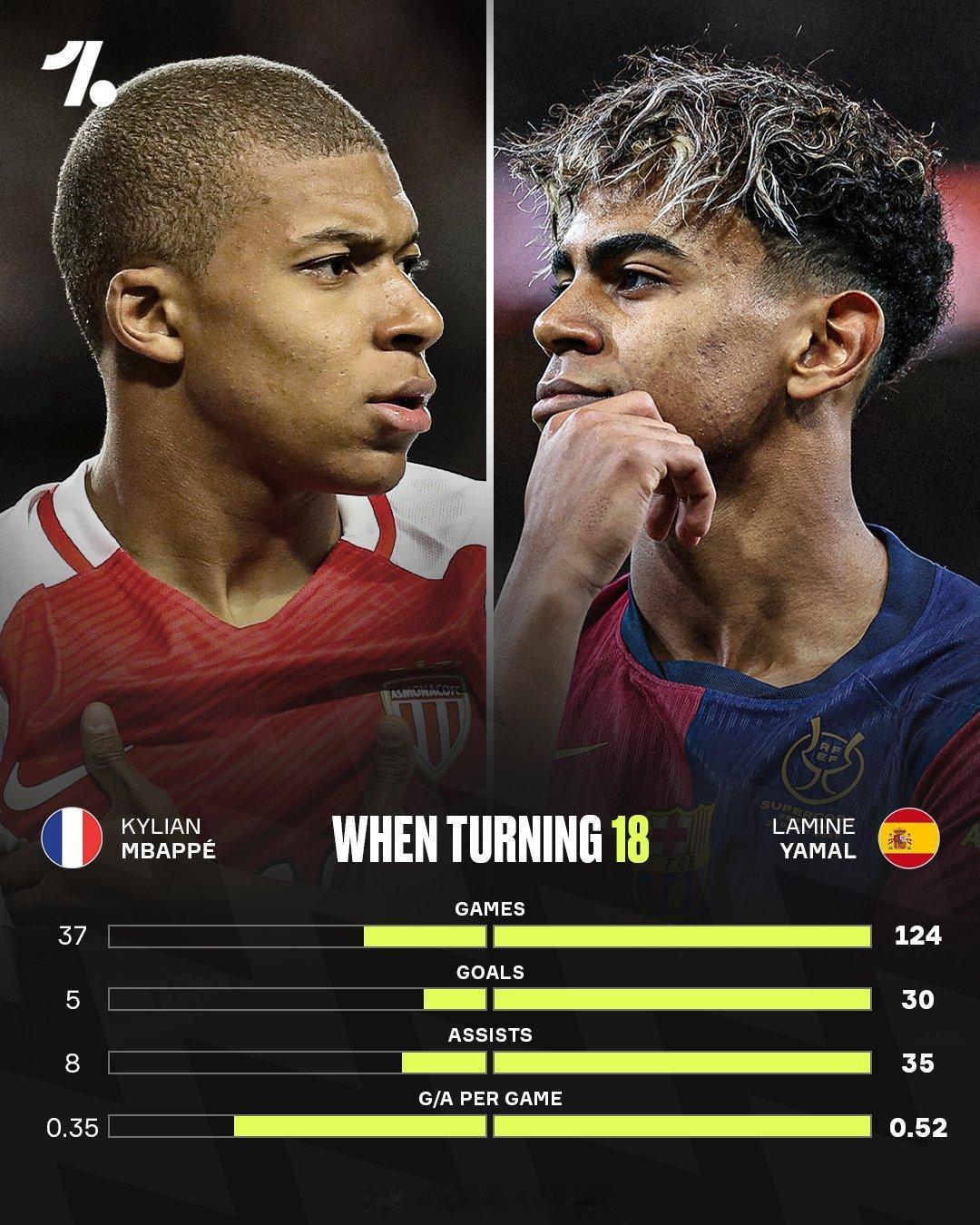 【18岁那年】18岁的与18岁的的比赛数据对比,包括比赛场数、进球数、助攻数和场均贡献。值得关注的是,18岁的亚马尔,在过去2年多的时间里,已经踢了124场正式比赛,这个比赛密度。。。。。。。