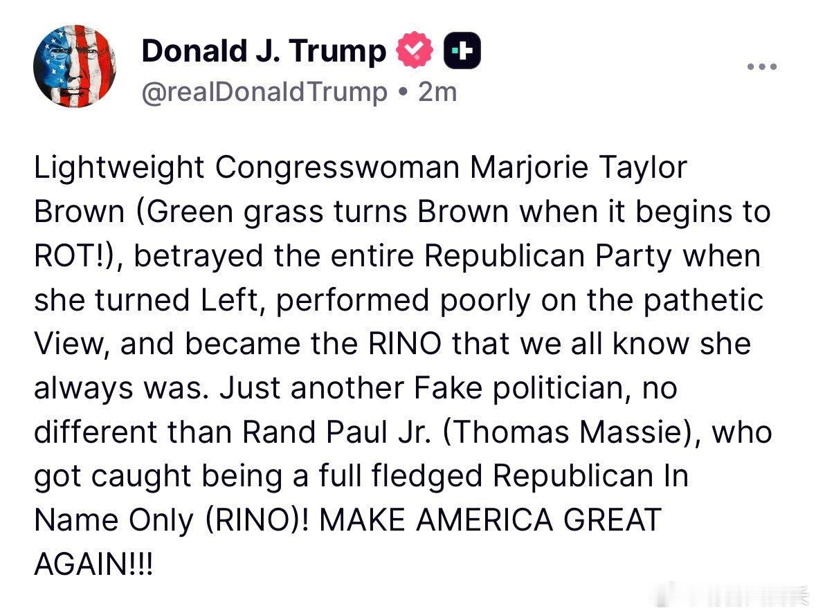 等一下。为什么玛乔丽·泰勒·格林要求公开爱泼斯坦文件,会被视为对特朗普和整个共和党的背叛?川普:“那个没什么分量的女议员玛乔丽·泰勒·格林(我给她起外号叫‘布朗’,意思是绿草烂了就成褐色!)背叛了共和党——她突然往左靠,跑去自由派节目《观点》里表现一塌糊涂,终于露出她本来就是‘冒牌共和党人’的真面目。跟托马斯·马西一样,都是伪君子,被抓个正着!让美国再次伟大!!!”