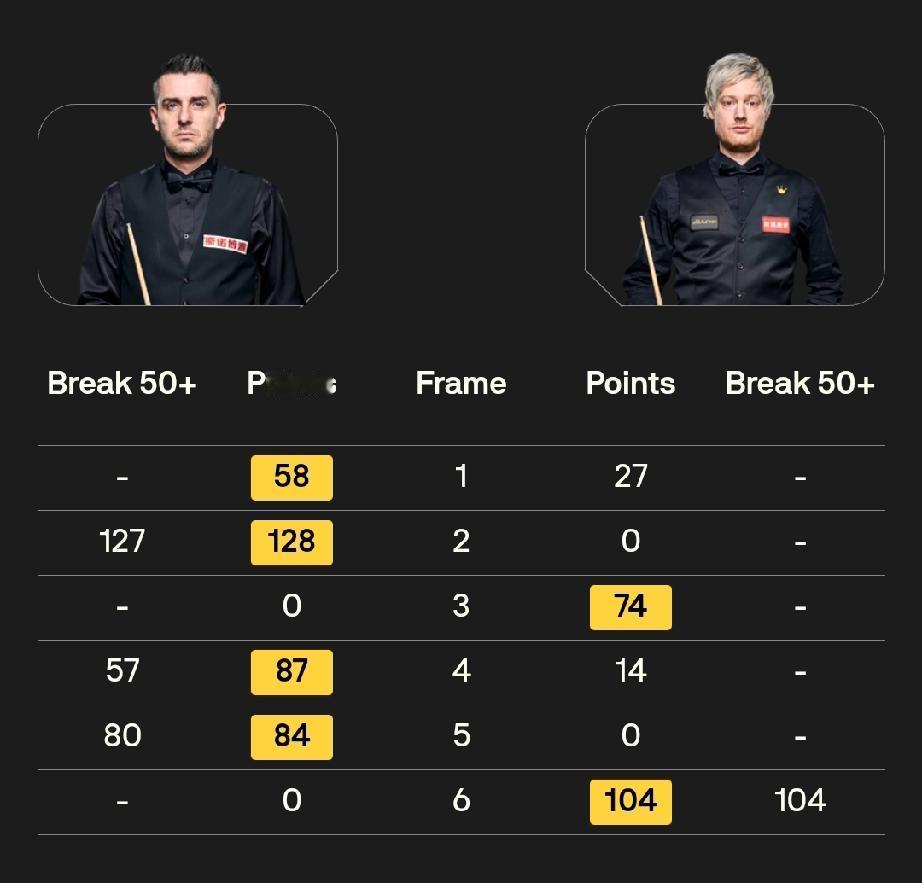 马克·塞尔比 4-2 尼尔·罗伯逊 11月16日,2025斯诺克冠中冠第二场半决赛,马克·塞尔比4-2领先尼尔·罗伯逊。胜者将与6-2战胜赵心童的贾德·特鲁姆普争夺冠军。 冠亚军奖金分别为15万和6万英镑。冠中冠属于邀请赛,不是排名赛。