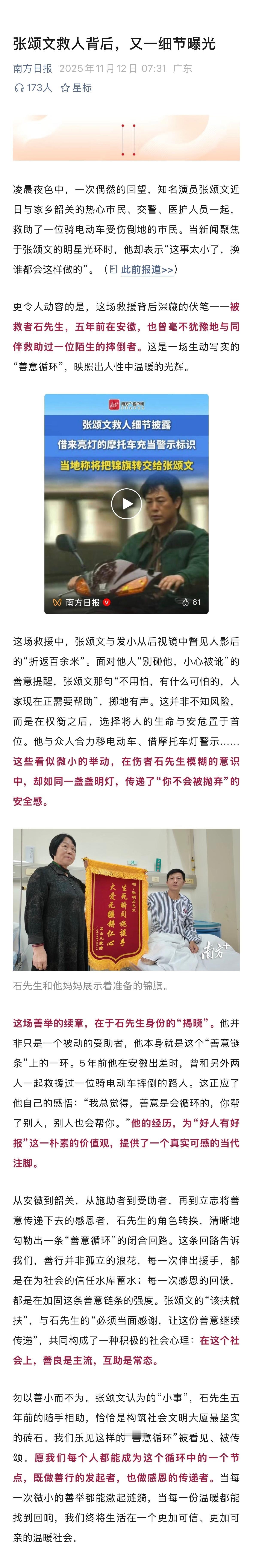 张颂文超话 我很喜欢报道张颂文救人事件的南方日报的第二篇报道文章,见P1。 P2首篇报道,P3事发+张颂文回应视频。 P4第三篇关于正开展他见义勇为评定的报道。 P1的第二篇报道,是报道原来被救的石先生,当初也曾在五年前救下一位摔倒者。 文章写到: 他的经历,为“好人有好报”这一朴素的价值观,提供了一个真实可感的当代注脚。 张颂文的“该扶就扶”,与石先生的“必须当面感谢,让这份善意继续传递”,共同构成了一种积极的社会心理:在这个社会上,善良是主流,互助是常态。 勿以善小而不为。张颂文认为的“小事”,石先生五年前的随手相助,恰恰是构筑社会文明大厦最坚实的砖石。我们乐见这样的“善意循环”被看见、被传颂。愿我们每个人都能成为这个循环中的一个节点,既做善行的发起者,也做感恩的传递者。当每一次微小的善举都能激起涟漪,当每一份温暖都能找到回响,我们终将生活在一个更加可信、更加可亲的温暖社会。 上面这些内容,就是为什么之前铺天盖地报道张颂文救人事件的,没有营销号,是一水的蓝V官媒。 自南京彭宇案后,扶不扶已经成为社会议题,人与人之间趋向冷漠。社会需要像张颂文这样有极大国民度传播力影响力的明星去传播真善美,宣扬好人好事,树立明星榜样,引导社会风气,更多一些温情。 后续报道见义勇为评定,我想既然已经报道出来,应该是稳妥的,张颂文值得,这个社会亦需要像张颂文这样的传播者,这样的典范榜样。