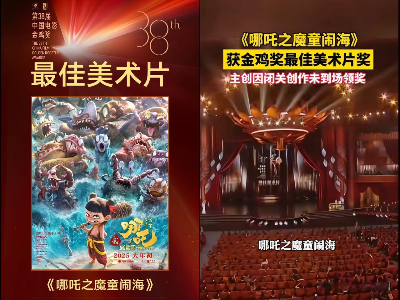 史上最尴尬的一幕出现了 哪吒魔童闹海获得了最佳美术片 结果现场居然 没人领奖,连个代表都不见踪影。 主持人解释说团队忙着投入新创作。主创来不了还说得过去,可资方都没人来,这就有点让人琢磨了。难道是哪吒压根不稀罕这奖?还是剧方对评奖不太认可呢? 说实话,《哪吒》在最佳导演、编剧、音乐还有特别贡献奖等方面,都挺有竞争力的。但金鸡奖也够硬气,说不给就不给。也许就因为这,哪吒干脆“不要”这奖了。这事儿大家怎么看呢?是不是觉得背后还有啥隐情?