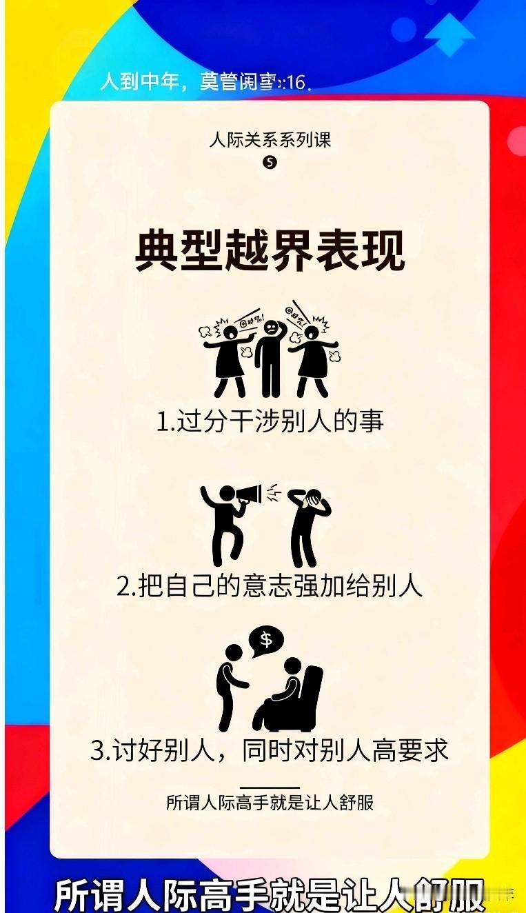 前两年总爱瞎操心,邻居夫妻吵架去劝和,结果被两边埋怨“多管闲事”;同事工作出错想提点,反倒被觉得“倚老卖老”;亲戚家孩子择校,热心给建议最后落得“站着说话不腰疼”。 后来慢慢明白,成年人的世界,大多是“各人有各人的因果”。别人没主动求助,你的好意就是多余的打扰,搞不好还会引火烧身。 中年人的精力就那么多,顾好自己的家庭、身体和工作就够累了。与其浪费时间管别人的闲事,不如把心思放在经营自己的小日子上。 不是变得自私了,是终于学会了边界感——尊重别人的选择,也守护自己的安宁。中年最好的状态,大概就是:守好本心,不渡他人,各自安好……成年人的世界“关我屁事”和“关你屁事” 真是顶级社交智慧! 你有没有因为管闲事吃过亏?评论区聊聊~