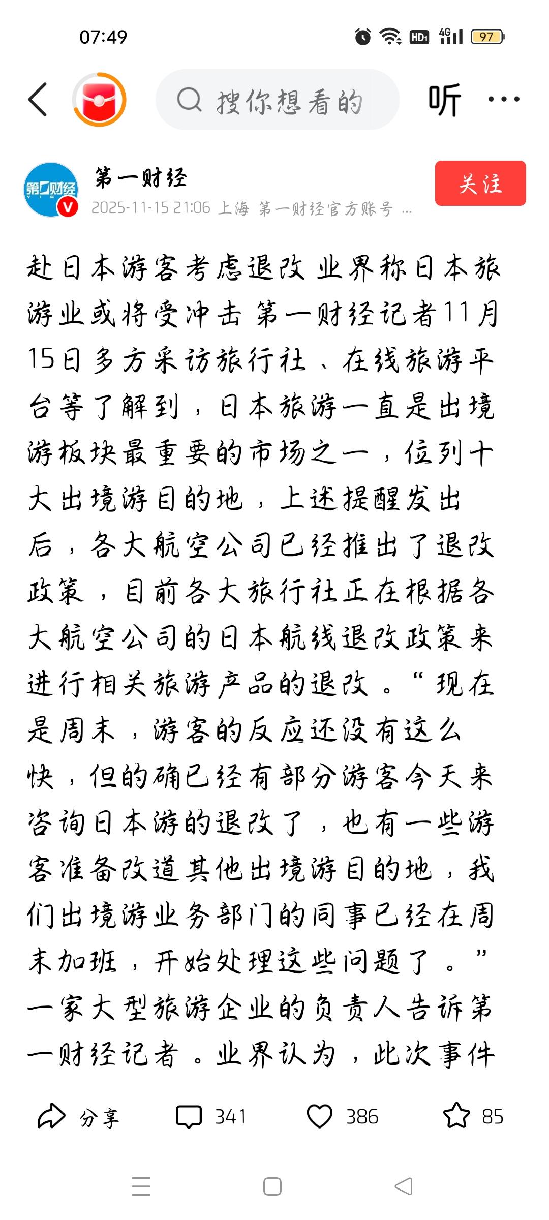 业界称日本旅游业或将受冲击,我想说 据第一财经报道,赴日本游客考虑退改,业界称日本旅游业或将受冲击,第一财经记者了解到,日本旅游一直是出境游板块最重要的市场之_,位列十大出境游目的地。中国政府已发出预警,建议中国公民谨慎出斿日本或赴日,我想说,这都是拜高市早苗所为,中国人不知来日本旅游了,意味着日本旅游业将受冲击,不来旅游,也就不买日本商品,日本人想赚中国人的钱,没有机会了。我说得对吗?欢迎评论。