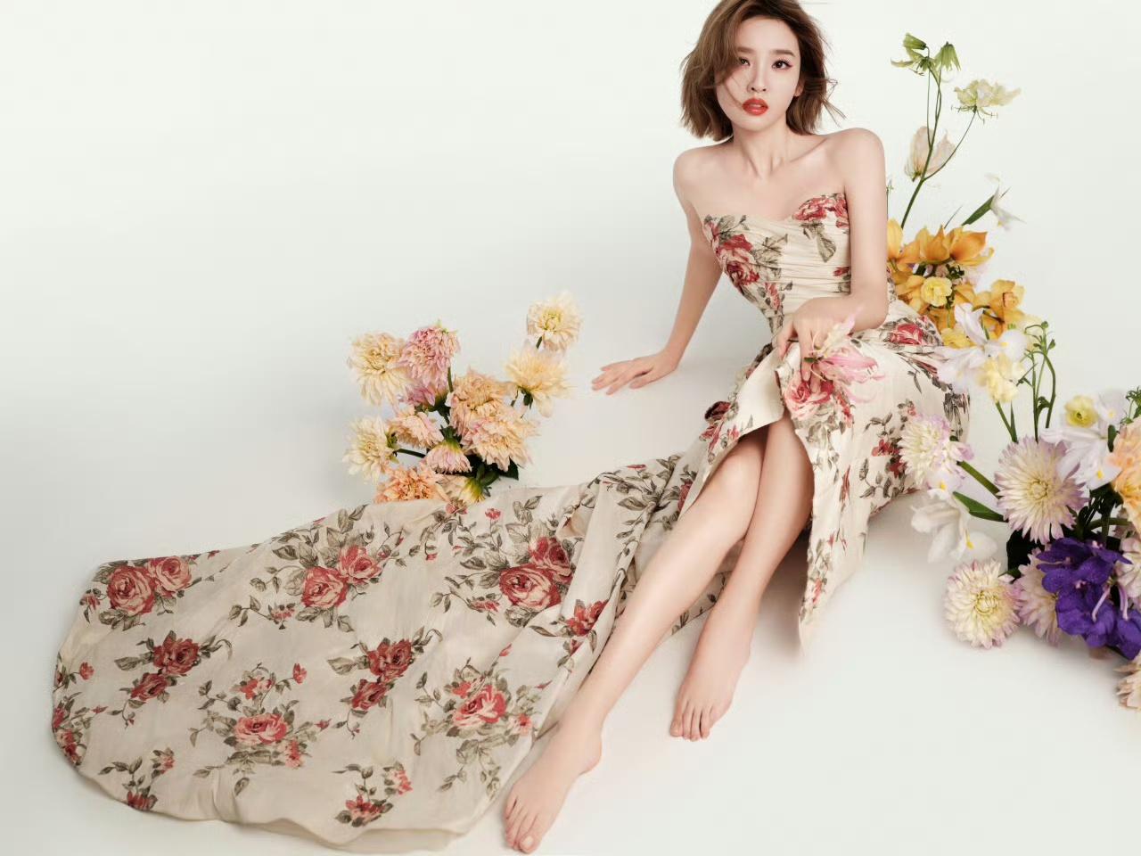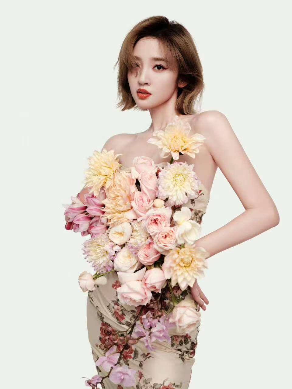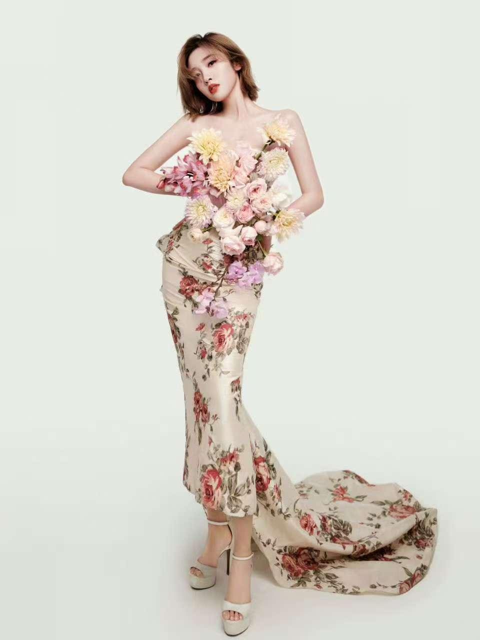 谁能想到唐艺昕,直接把鲜花穿在身上玩出了封神级效果?她把一大簇粉黄鲜花直接裹成抹胸,软乎乎的花瓣贴在肩颈边,配着同色系玫瑰印花长裙,修身面料刚好掐出腰臀间的流畅曲线,红唇衬着白肤,肩颈线又细又直,连垂落的裙摆都裹着花意。 唐艺昕这条裙是高腰+收腰+微包臀的鱼尾款:腰腹处紧收,刚好露出纤细腰肢;臀腿处微贴线条,放大腰臀比的优势;拖尾裙摆又增加了柔美感,同时露出肩颈、脚踝这些纤细部位,显瘦又显舒展。