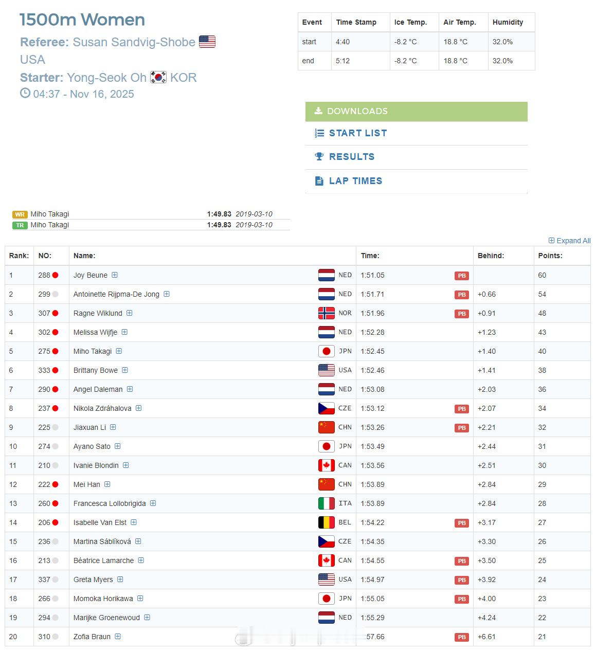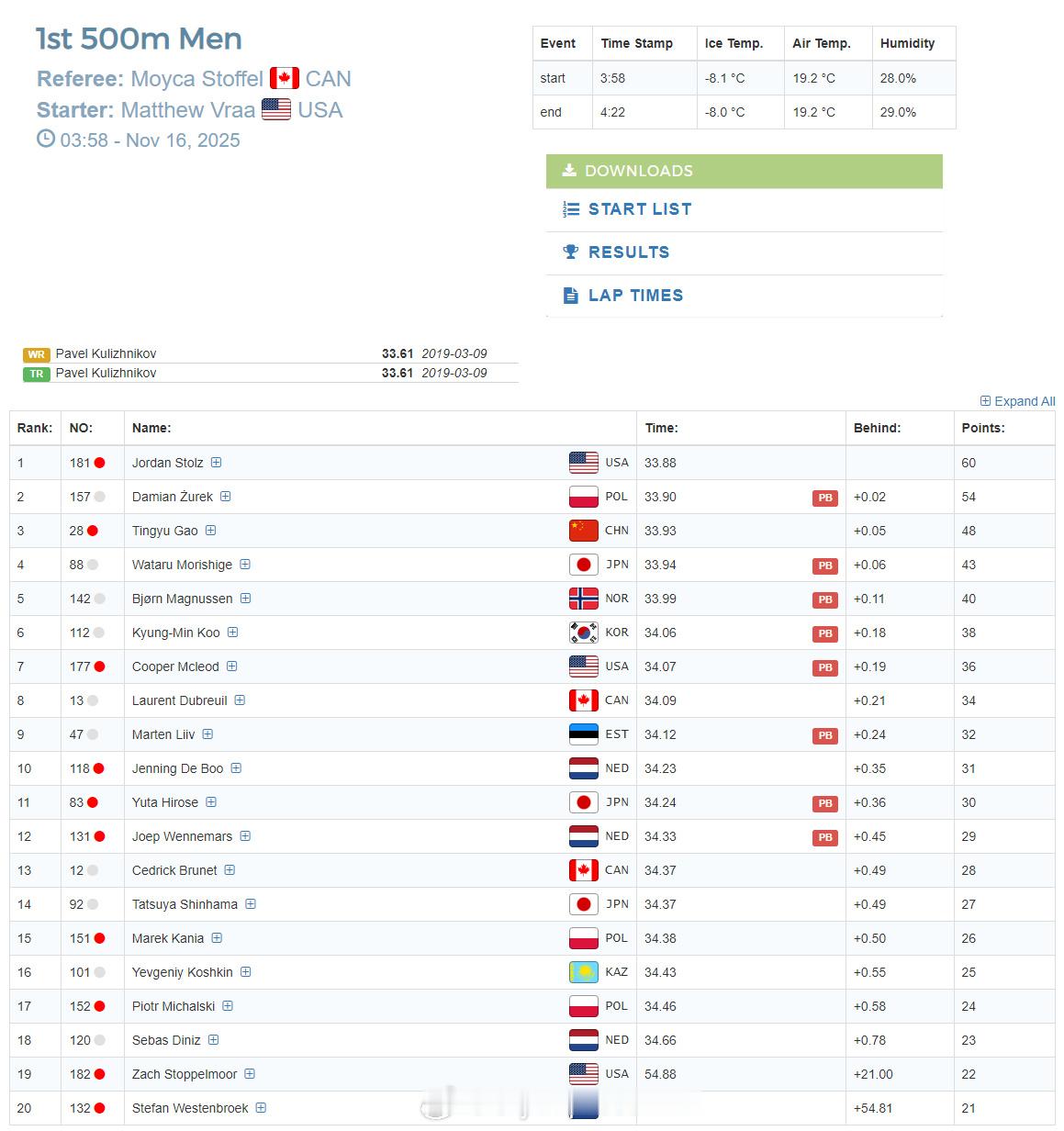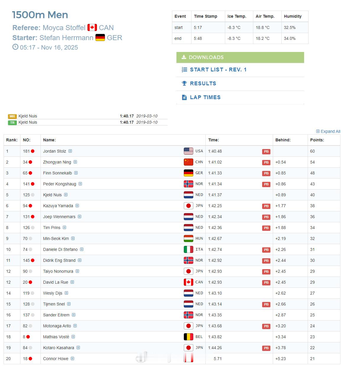 【速滑世界杯宁忠岩摘银高亭宇夺铜】 11月15日,速滑世界杯美国盐湖城第二比赛日,中国选手夺得1银1铜。在男子1500米比赛中,宁忠岩以1分41秒02获得亚军,美国名将斯托尔茨领先0.54秒夺冠,德国索内卡尔布摘得铜牌。在男子500米(第一次)比赛中,斯托尔茨以33秒88夺得金牌,中国名将高亭宇落后0.05秒获得铜牌,波兰祖雷克摘银。荷兰比恩获得女子1500米冠军,中国队李佳轩和韩梅分列第九和第12位。此外,田芮宁排名女子500米(第一次)第12,荷兰科克夺得冠军。
