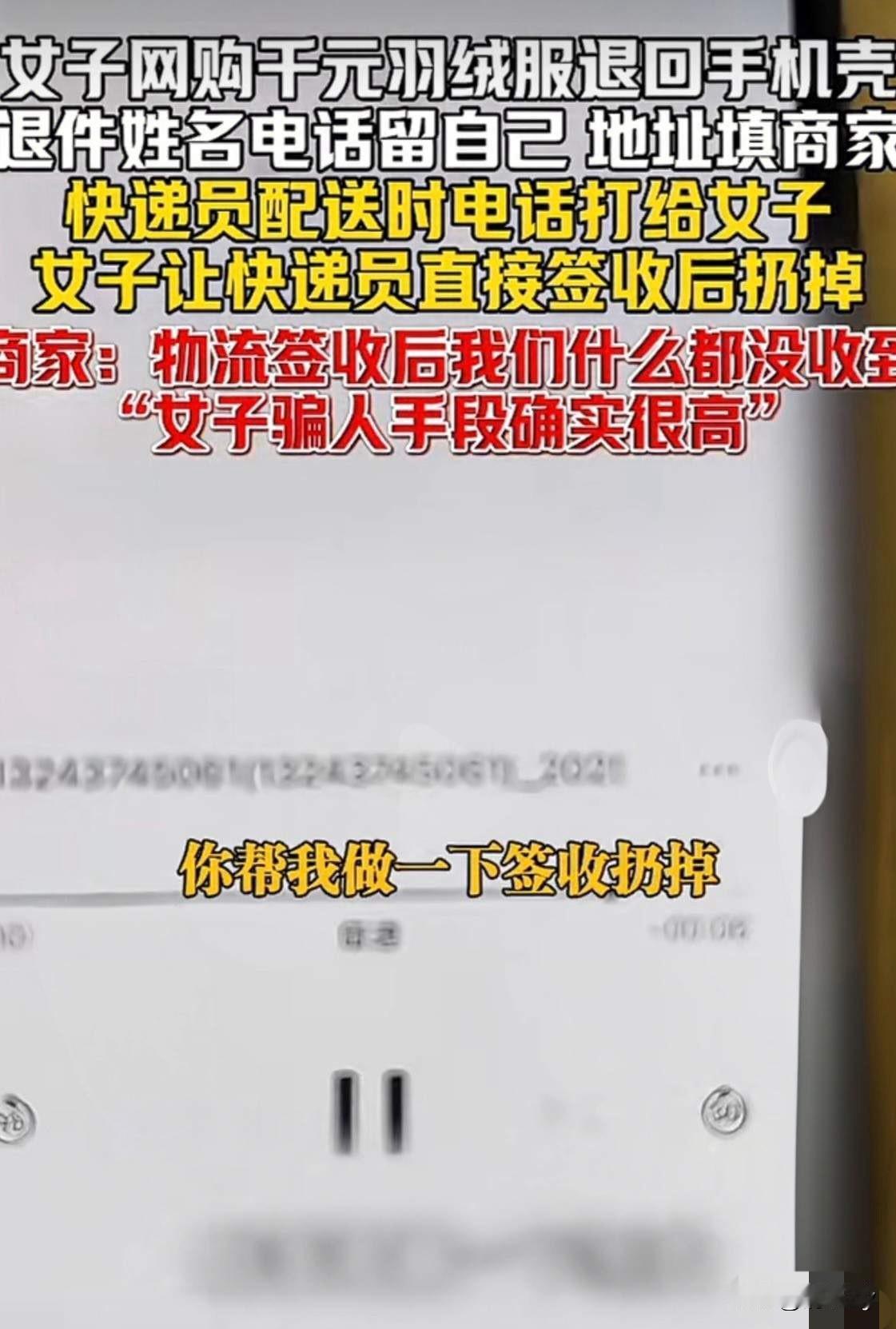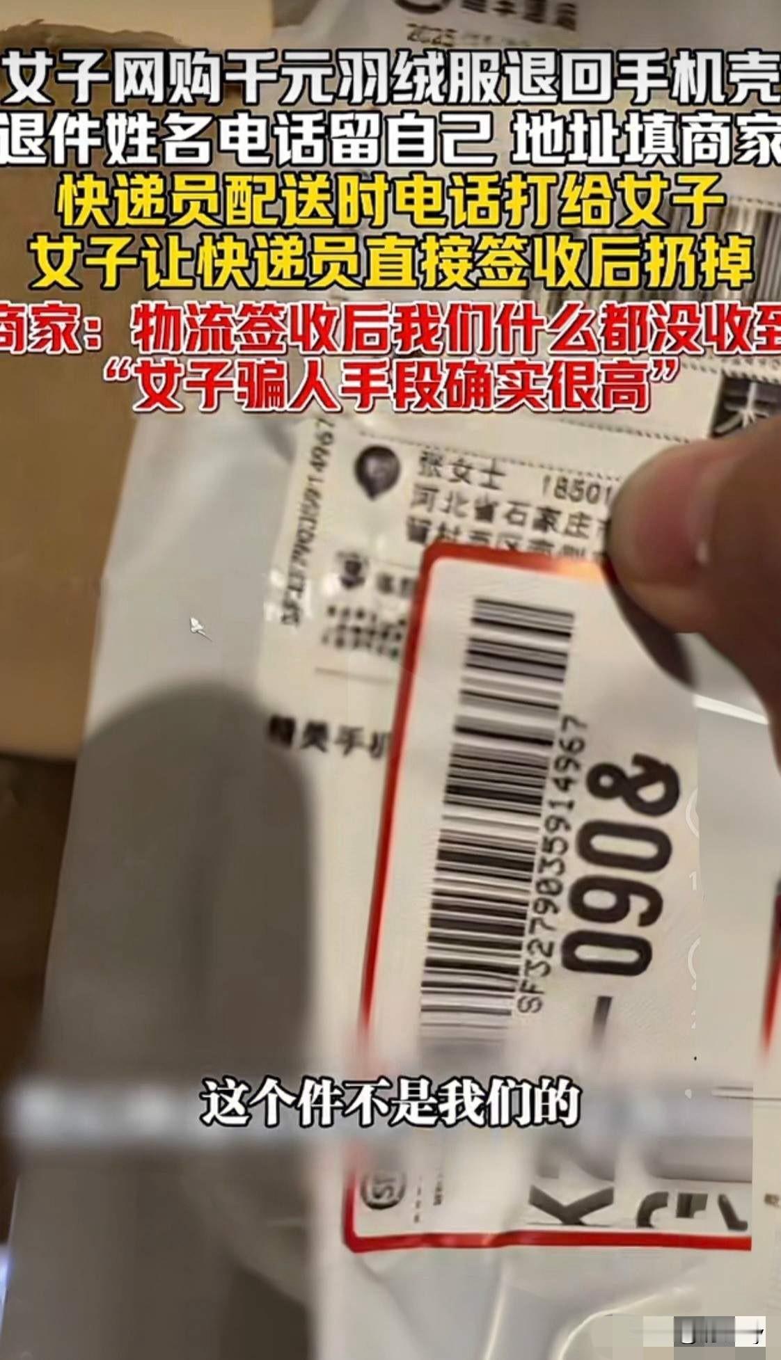 一女子网购一件998元的羽绒服,到货后申请退货,她寄回给商家的不是羽绒服,而是一个手机壳! 女子把收货地址写成是商家的,联系方式却留的是自己的名字和电话,快递员接到货时给女子打电话,女子让直接签收扔掉就可以了! 商家于先生看着物流“已签收”的提示有点傻眼,什么都没收到,怎么会签收了呢?赶紧联系快递员,快递员把录音给了商家! 随后于先生向平台举证拒绝退款!经过与买家女子的沟通,女子愿意把羽绒服退回商家,并且向于先生道了歉!对方称自己是大学生,因为贪图小便宜才这么做! 1000块钱的羽绒服竟然敢拿一个手机壳去冒充,证明这女子的胆子够大,很明显不是第一次这么干了!这那是在退货分明就是在欺诈! 这种不诚信的买家平台就应该给她列入黑名单,不能再让她在平台购买任何品牌的商品! 还好快递员留了录音