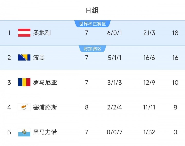 直播吧11月16日讯世预赛欧洲区,奥地利2-0击败塞浦路斯,目前2分领跑H组。奥地利末轮对阵波黑,打平就可以直接晋级世界杯。