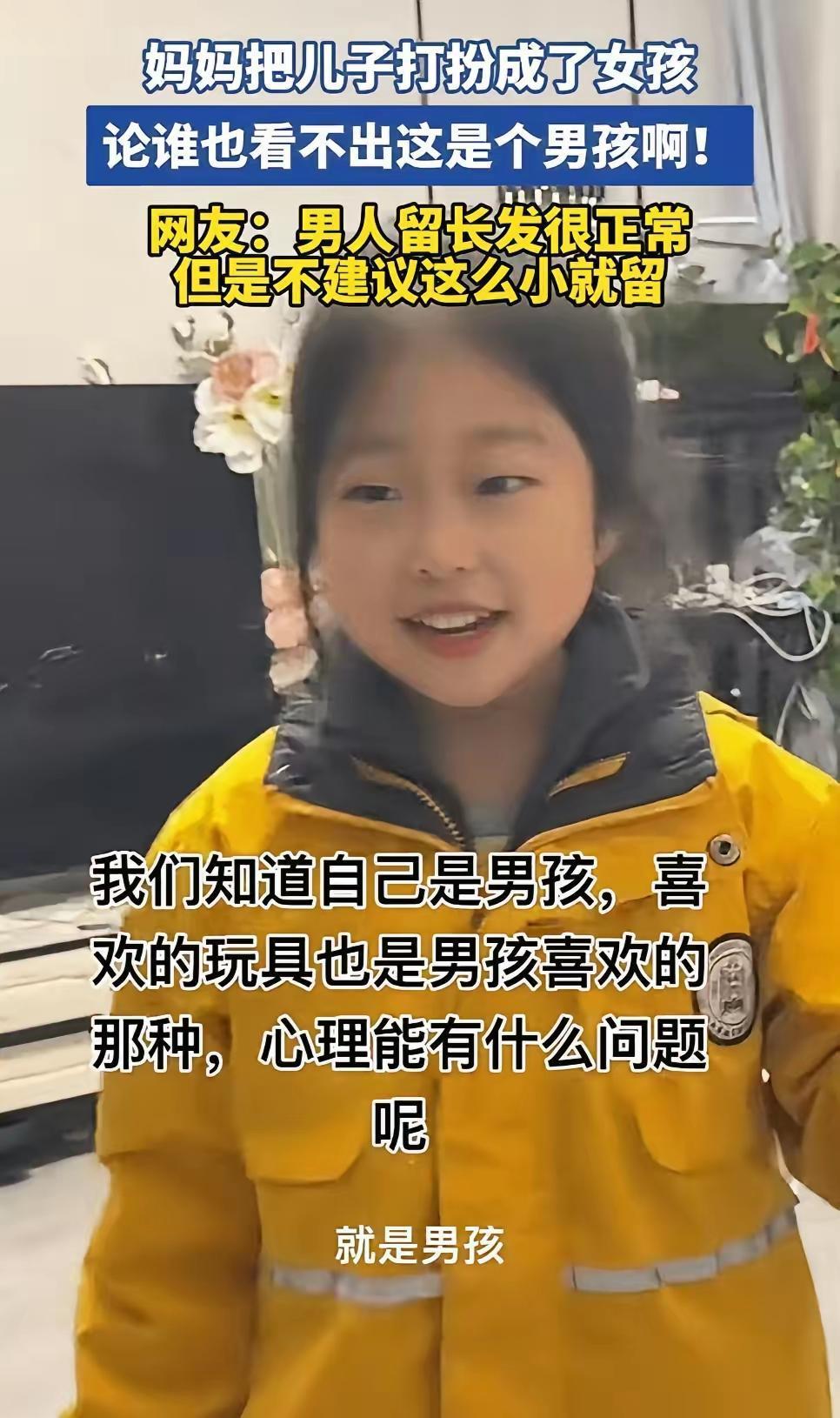“太无语了!”河南一名妈妈给儿子留了长发,结果别人一直以为他是女孩子,然后妈妈拍视频让儿子和大家说到底是男孩还是女孩,男孩告诉大家他就是男孩,不相信给大家看看。 网友评论: 家长,如果长时间当女孩子养,那长大以后发出来的声音有可能就像女孩子,我有个同学,明明是男生,却跟女人一样。 我剪了20多年头发,遇到很多小女孩剪短发像男孩一样,前段时间遇到一留长发的,家长还要我给剪个法式小刘海,穿的衣服都是女孩款,我一直也为是个小女孩,到最后剪完了,他爸对着孩子说了句:儿子,这个发型满意吗。 男人要有男人的样子,女人要有女人的样子,各个年龄段又有适合的打扮。假如一次看到一个老头穿裙,高跟鞋,满街人都用异样的眼晴看,认为有精神病!人要在社会里生活,要适应社会人的眼光! 我家儿子小时候我也给留长发,记得以前去澡堂洗澡女服务员以为也是女孩,脱完衣服一看是男孩,抱起来就给大家看,那时候孩子小也不懂的害羞。 孩子应该从小要培养性别认知啊,这妈妈不是随性是不负责任!孩子长大了问题就会凸显的。