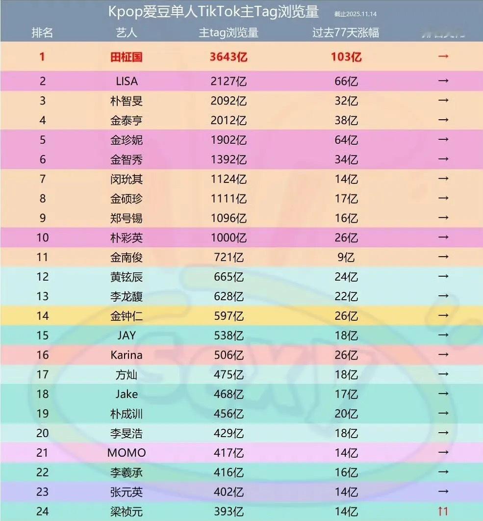 Kpop爱豆TikTok最高主tag浏览量第十六名柳智敏第二十三名张元英 是因为张元英不怎么发单人抖的原因吗?