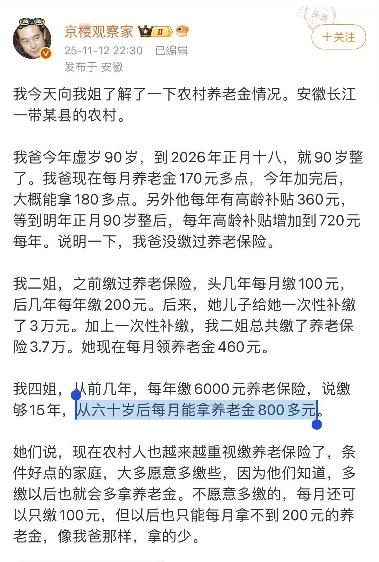 今年起,安徽给每一个农民的养老金提高20+5元,农民的养老金提高25元!安徽是农业大省,农民大省,一笔刚性支出。整个安徽省城乡居民养老支出计算,全省有1106万老人,这不是个小数目。