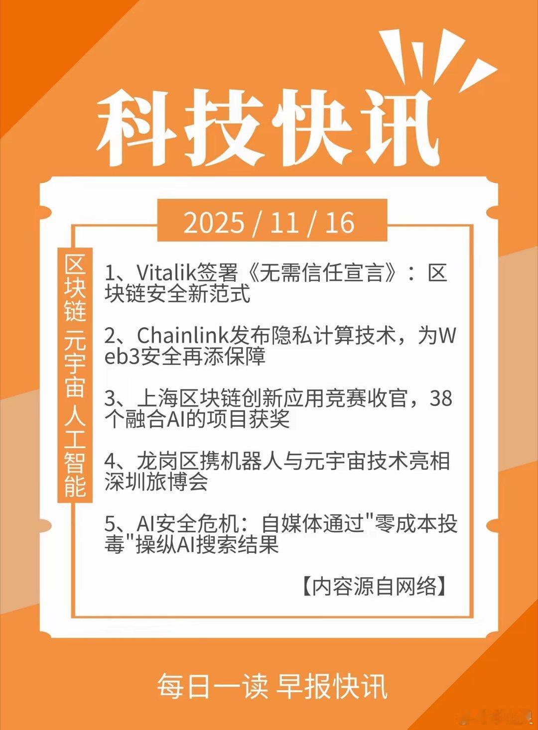 科技快讯 | 11月16日 星期日1、Vitalik签署《无需信任宣言》:区块链安全新范式2、Chainlink发布隐私计算技术,为Web3安全再添保障3、上海区块链创新应用竞赛收官,38个融合AI的项目获奖4、龙岗区携机器人与元宇宙技术亮相深圳旅博会5、AI安全危机:自媒体通过"零成本投毒"操纵AI搜索结果—内容源自网络—、、