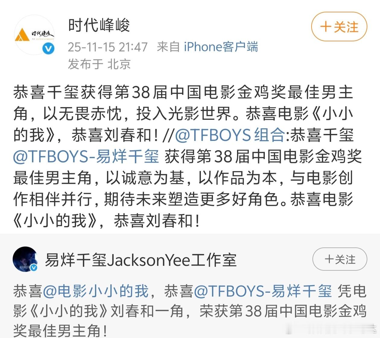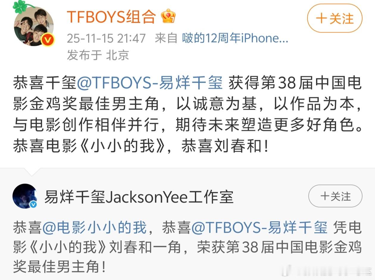 TFBOYS组合和时代峰峻发文恭喜易烊千玺获得第38届中国电影金鸡奖最佳男主角