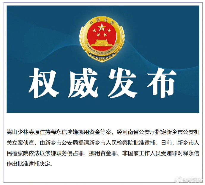【新乡市人民检察院依法对释永信批准逮捕】嵩山少林寺原住持释永信涉嫌挪用资金等案,经河南省公安厅指定新乡市公安机关立案侦查,由新乡市公安局提请新乡市人民检察院批准逮捕。日前,新乡市人民检察院依法以涉嫌职务侵占罪、挪用资金罪、非国家工作人员受贿罪对释永信作出批准逮捕决定。(新华社)