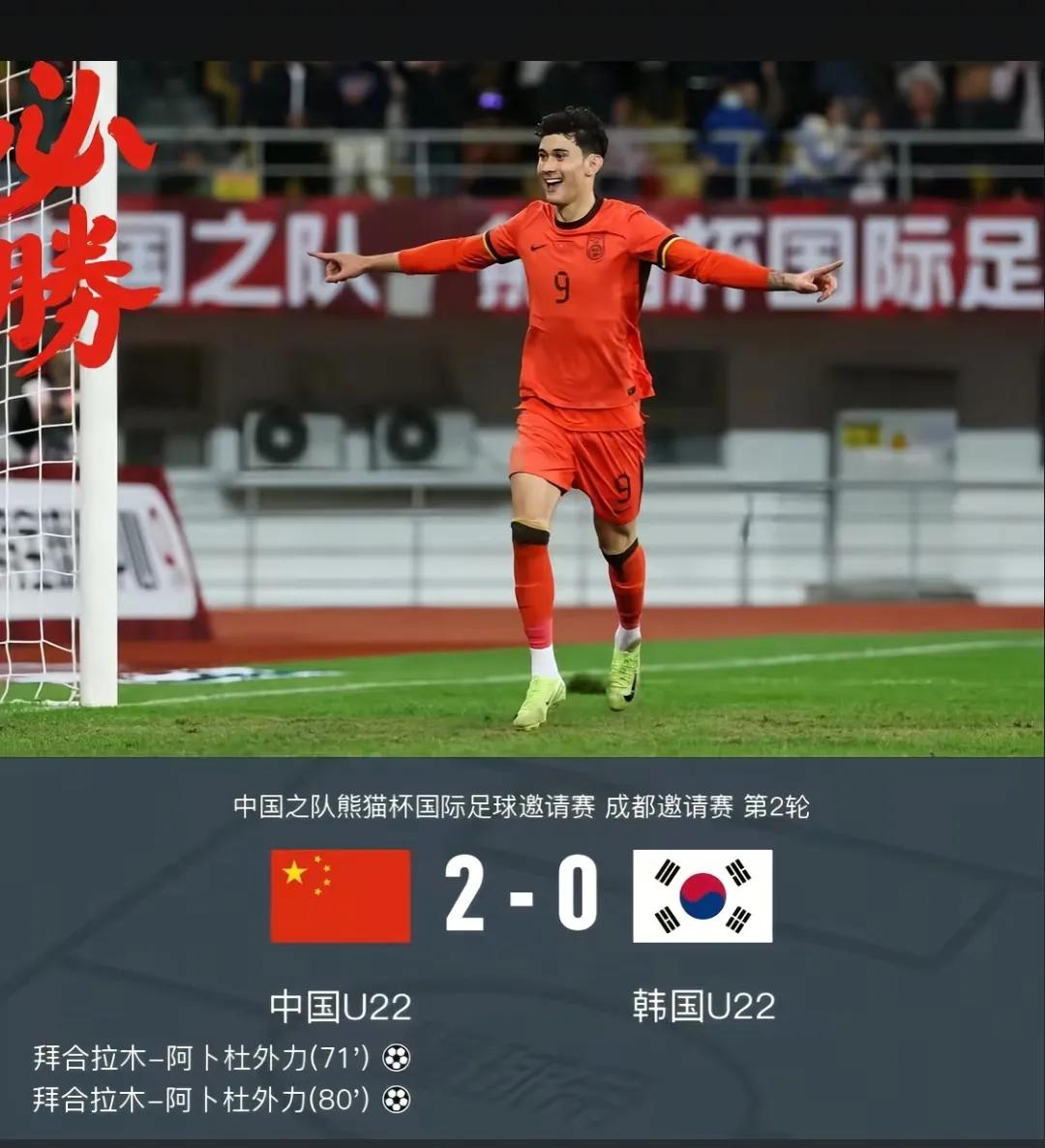 韩国队员终于被中国队打跪下了,拜合拉木梅开二度,让中国U22国足2比0击败韩国U