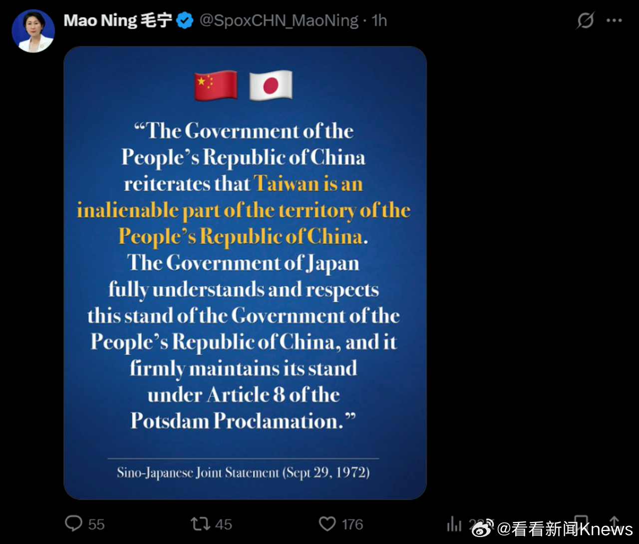 【】11月16日,中国外交部发言人毛宁在社交平台上援引1972年《中日联合声明》中涉台内容,用英语、日语双语发布4张海报提醒日方“无论谁当政,日本都必须信守承诺”。毛宁先后用英日双语发帖称,“1972年的《中日联合声明》里白纸黑字写着,‘日本国政府承认中华人民共和国政府是中国的唯一合法政府’,以及‘日本国政府充分理解和尊重中国政府关于台湾是中华人民共和国领土不可分割的一部分的立场。’无论谁当政,日本都必须信守承诺。”帖文中,毛宁还配上了四张包含上述内容的英日双语海报。