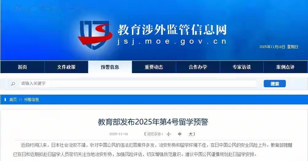 教育部刚发布赴日留学预警,这就像一个家长叮嘱要出门的孩子:“那边最近风气有点复杂,凡事多留心。”主要原因在于,日本社会右翼排外情绪外情绪有所上升,针对中国留学生的歧视和无端审查案例增多了。 这事也反映出当前中日关系确实遇冷了。福岛核污水、台海问题海问题等一系列摩擦,导致双方的政治信任度下降,大环境透着些凉意。 所以总结下来就是:留学本身没问题,但你得对那边的社会环境和政治气氛有心理准备,把安全问题放在心上。中日关系 海外留学