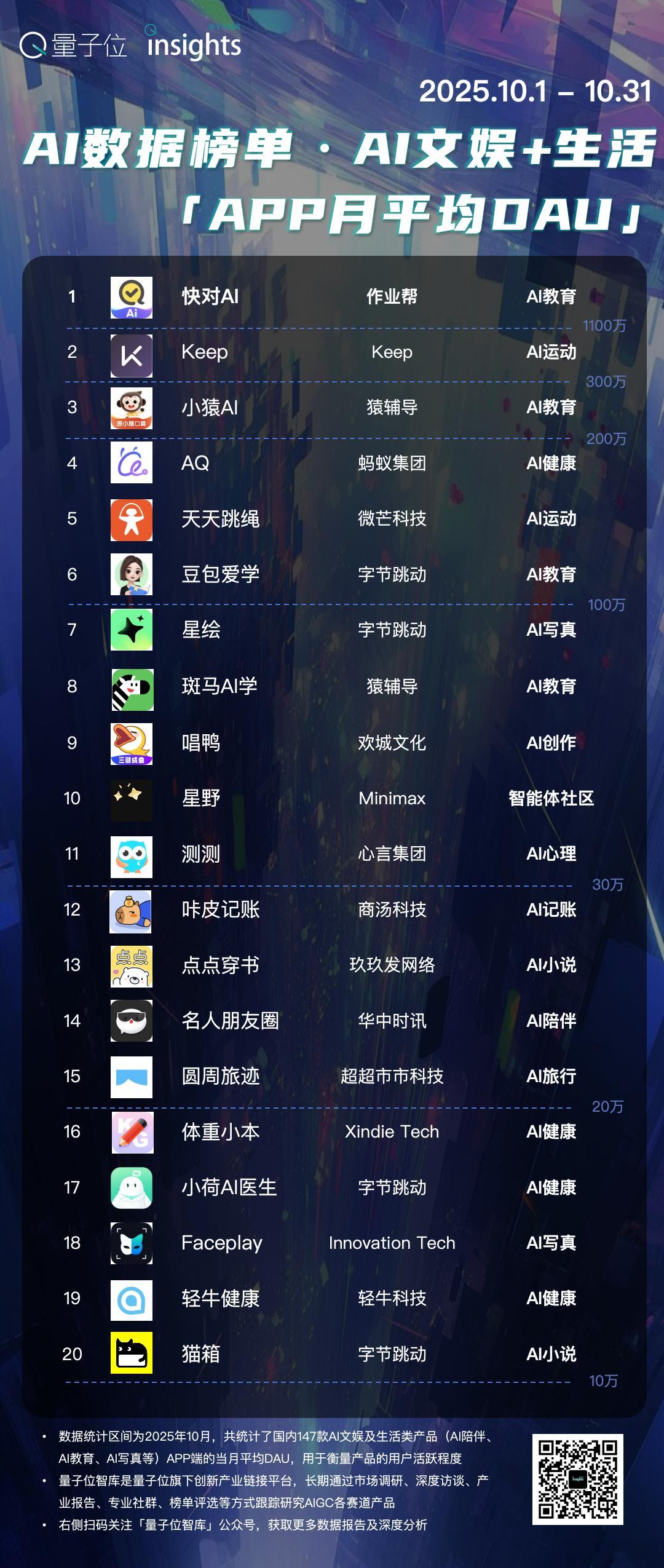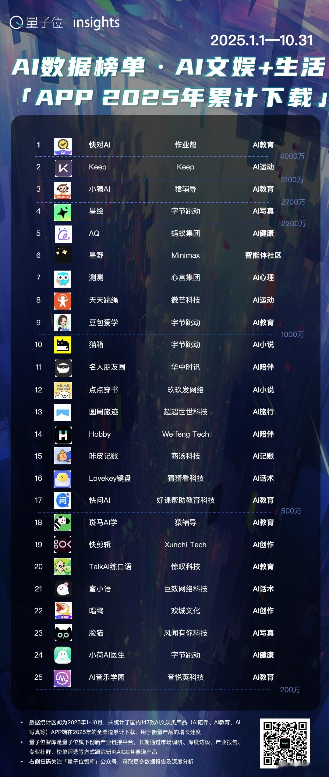 AI文娱+生活赛道APP产品,10月最新数据出炉了。在量子位智库入库统计的150余款AI文娱+生活类产品中,10月下载总量约3600万,相比9月有所下降。快对AI和小猿AI两款AI教育应用在10月延续了过往出色表现,下载量实现了30%以上的增长,位列新增下载榜单的前两名。AI健康应用AQ和小荷AI医生在9月份的爆发式增长过后,10月份的下载量都有所下跌,但这两款产品的日活用户数增长都超过60%。具体数据,依然关注的是以下关键维度——- APP端当月新增下载量- APP端当月平均DAU- APP端新增三日留存率- APP端2025年累计下载- 各指标增长率本文结论仅覆盖至2025年10月,期望能够从用户增长、用户活跃、用户粘性和用户规模等维度提供最新参考。