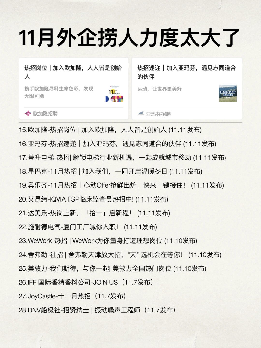 很多人都以为外企到了年末就不会招人,结果11月的招聘热度一下子爆棚,招聘公告一个接一个地放出来。 . 而且福利真的很好,不加班、955、年假15天以上,不仅如此,还有健全的员工福利体系、弹性工作、远程办公这些,是真的很爽 . 而且很多岗位要求的英语水平并不高,大部分岗位可以用中文沟通。如果是已经有了一定的工作经验的话,就更有优势了 . 总之看了我11月笔记的应该发现了,11月机会真的比你想象中的多得多,真心建议大家都去大胆试试 . 坚持日更✊🏻,对外企感兴趣的欢迎常来看看 . 跳槽 外企工作 空窗期 找工作 找工作啊找工作 外企 找工作别走弯路神仙公司 外企打工人 #留学生找工作 offer先生社招版