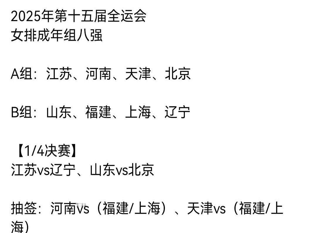 福建没拿B组第一,代价是提前撞天津。 抽签一落地,弹幕全在刷“下下签”。 天津那边估计偷着乐:李盈莹对上福建矮个副攻,像打生联赛。 可排球这玩意儿,轮到谁手硬才能说话,福建快起来连自己都怕。 另一边,河南抽到上海,才是真·黑马互啄。 朱婷要是打,上海老胳膊老腿得被抡成表情包;朱婷若歇,河南的小将们就得靠一口气撑到底。 山东对上北京,基本提前写进四强。 江苏打辽宁,丁霞传得再花,也架不住对面三叉戟轮番轰炸。 今晚七点开赛,谁输谁回家。 想爆冷?先把心跳调到120再说。