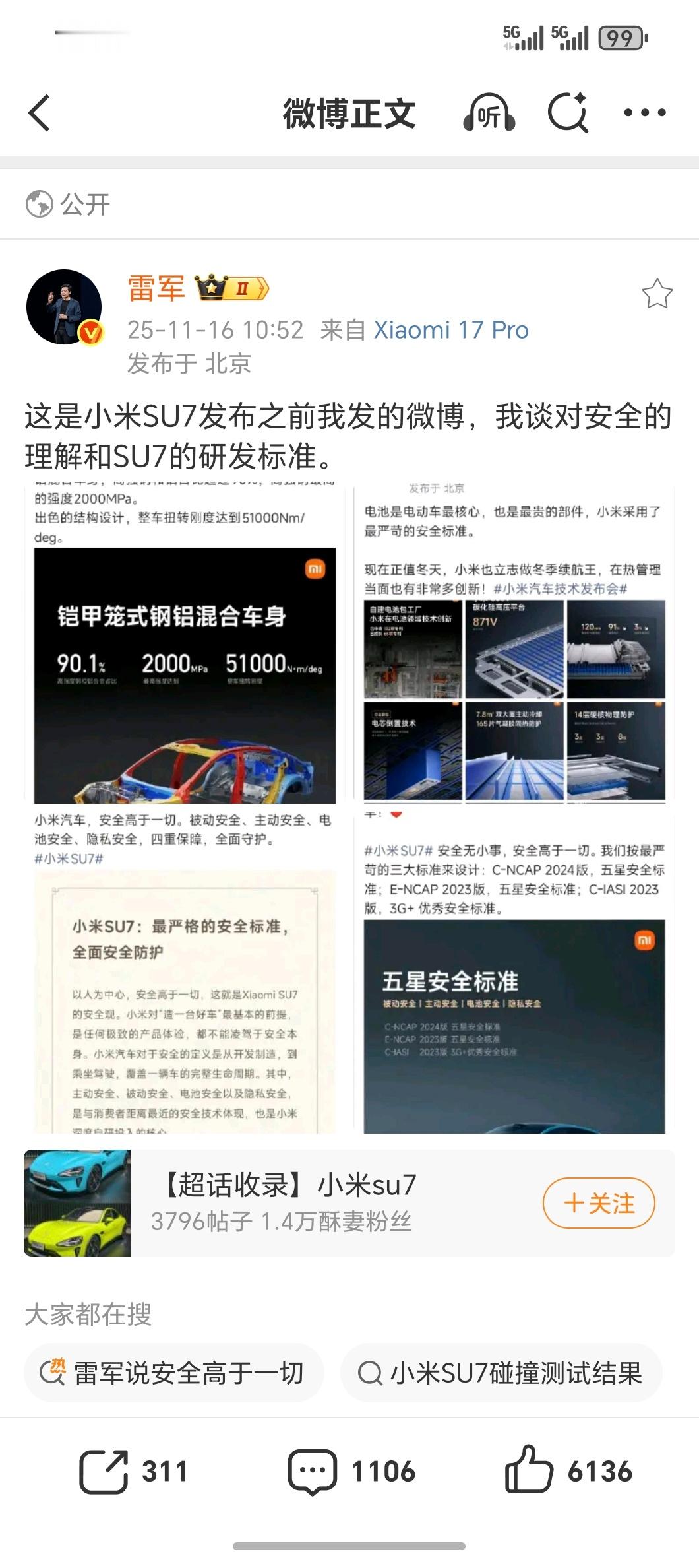 看把雷军都逼得连发三条微博自证!近期针对小米的抹黑、造谣拼接内容层出不穷,断章取义小米造车只靠设计不看安全,要知道小米SU7上市一年多卖了快30万台,单车型角度这个保有量相当大,如果真的有什么安全隐患早就爆出来了相反,不论是权威碰撞测试的优异表现,还是多起真实事故中的实际反馈,都印证了SU7的被动安全相当可靠。安全是前提、是一切,颜值即正义,这两者本就不冲突