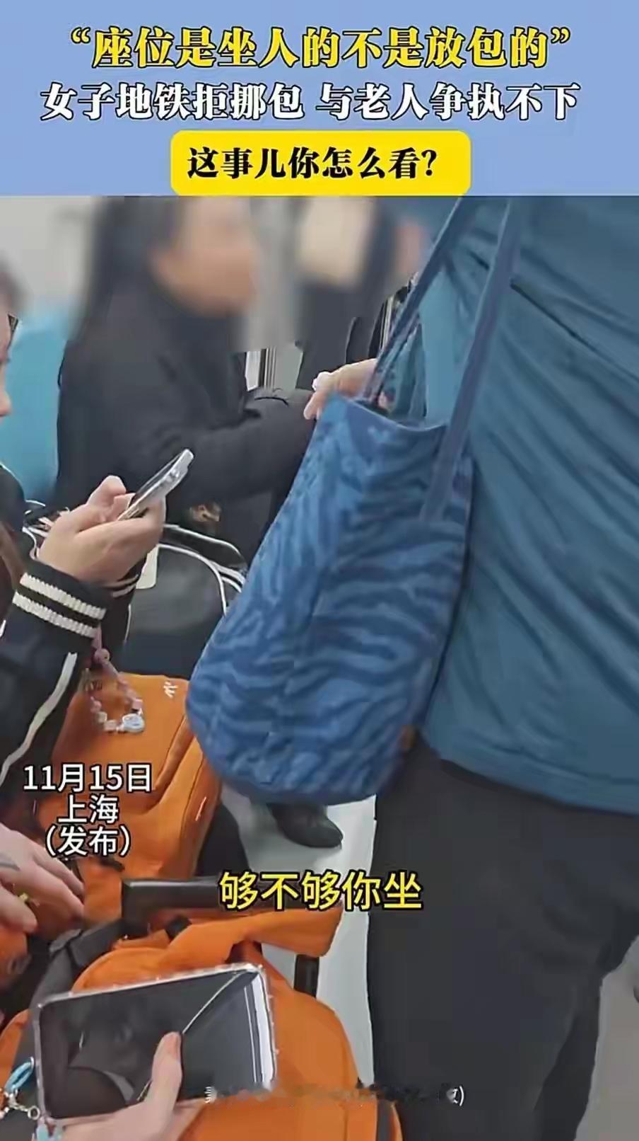 “一座一包,谁更贵?”上海地铁高峰,黑衣女把手提包按在空位,两位老人想落座,她仰脸连问:“一个人座位,你俩坐得下吗?”网友:包买票了? 地铁行驶中车厢拥挤,空位稀少,女子40余岁,黑衣高马尾,先将背包占座,不见同伴;隔壁老夫妻手握吊环,老太太轻声说“他坐”,女子伸指连喊:“这够不够你坐?” 大爷要求移包,女子攥住不放,大爷动手拎包,女子抢回再压座上,并推老人一下,双方口角升级,大爷怒斥“混蛋”,女子复读同一句话,声量更高。 老太太边拦丈夫边重申:“座位是人坐的,不是放东西”,女子仍嘟囔原句,不挪包也不起身,周围乘客无法劝动。 众人担心老人身体,只得劝老两口离开,粉衣乘客半扶大爷走向另一节车厢,女子继续抱包占座,事件全程被录。 视频热传后,评论指出其行为既失德又违规,呼吁地铁方及时介入,避免“谁闹谁得利”。 对于这件事情,大家有什么看法? 今天的分享到这里就结束了,大家对此事有何看法,欢迎在评论区留言和讨论,感兴趣的可以点击头像加关注,我将每日更新优质内容,我们下期见。