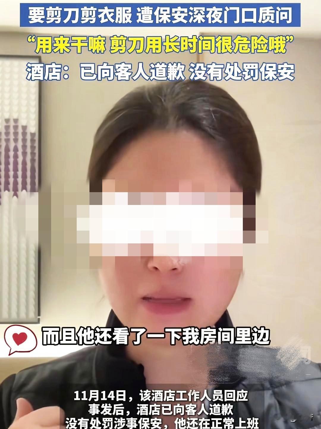 这下出名了 不止甘肃 全国人都知道了“谁能想到 女子入住酒店借剪刀被骂上热搜” 本想发视频控诉酒店保安 态度不好管得太多结果被网暴是自己 酒店对剪刀这类危险物品 本就有管理规范 保安问用途、提醒使用时长 不过是尽安全职责 网友一边倒点赞保安 恰恰说明大家看透了“弱势叙事”的套路 服务行业不是无底线迁就 安全责任比“无条件顺从”更重要 女子只想着自己方便 却忽视了酒店要承担的安全风险 说白了就是把别人的负责当成了针对 现在的网友越来越拎得清 不会轻易被片面之词带偏 遇到这种情况你会站哪边