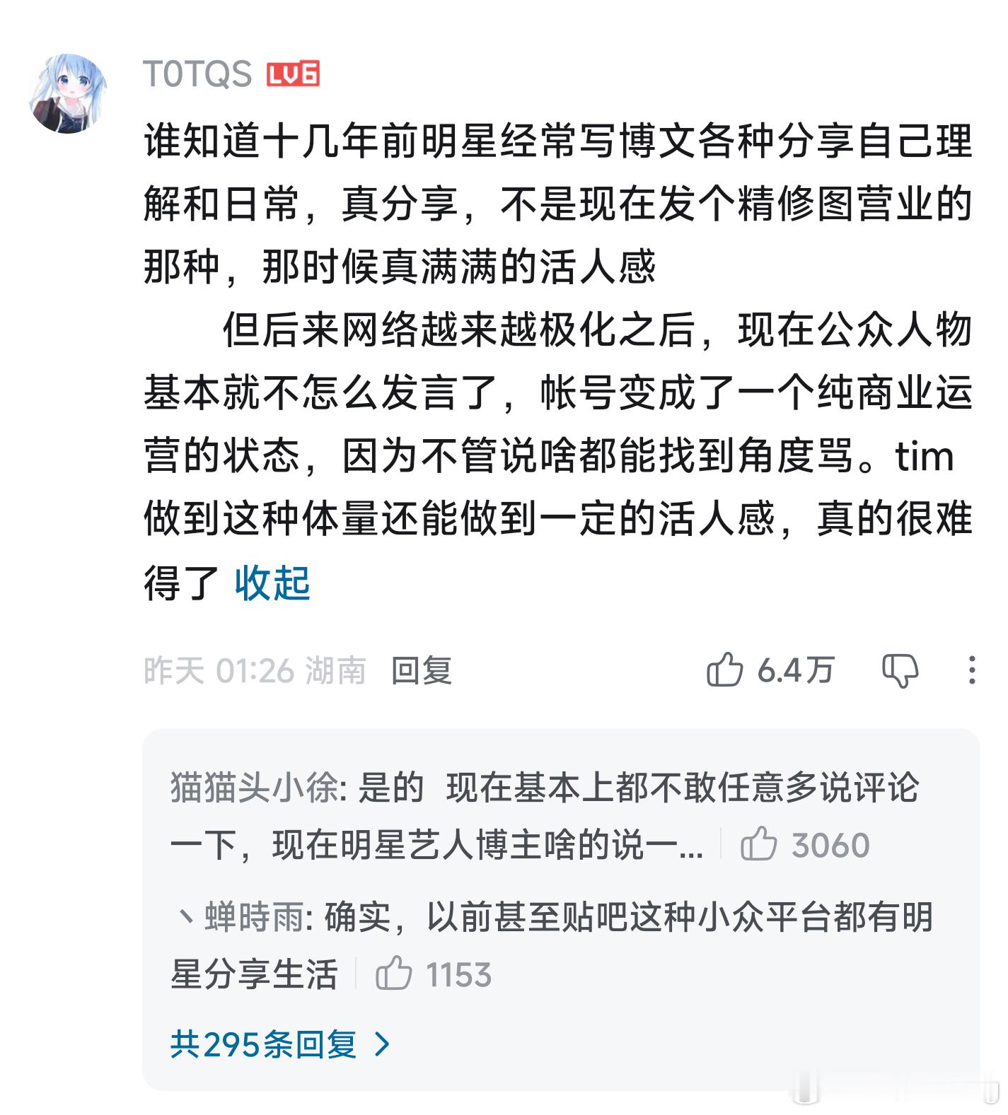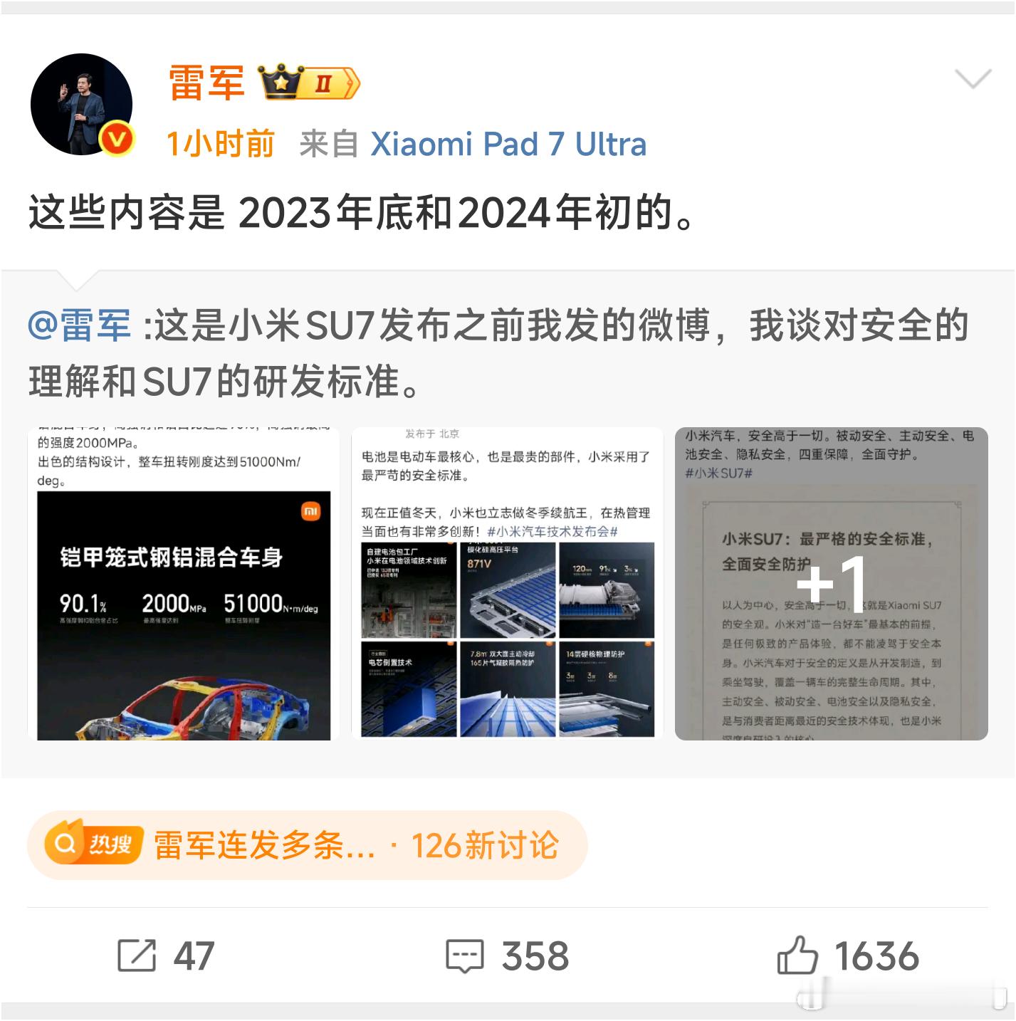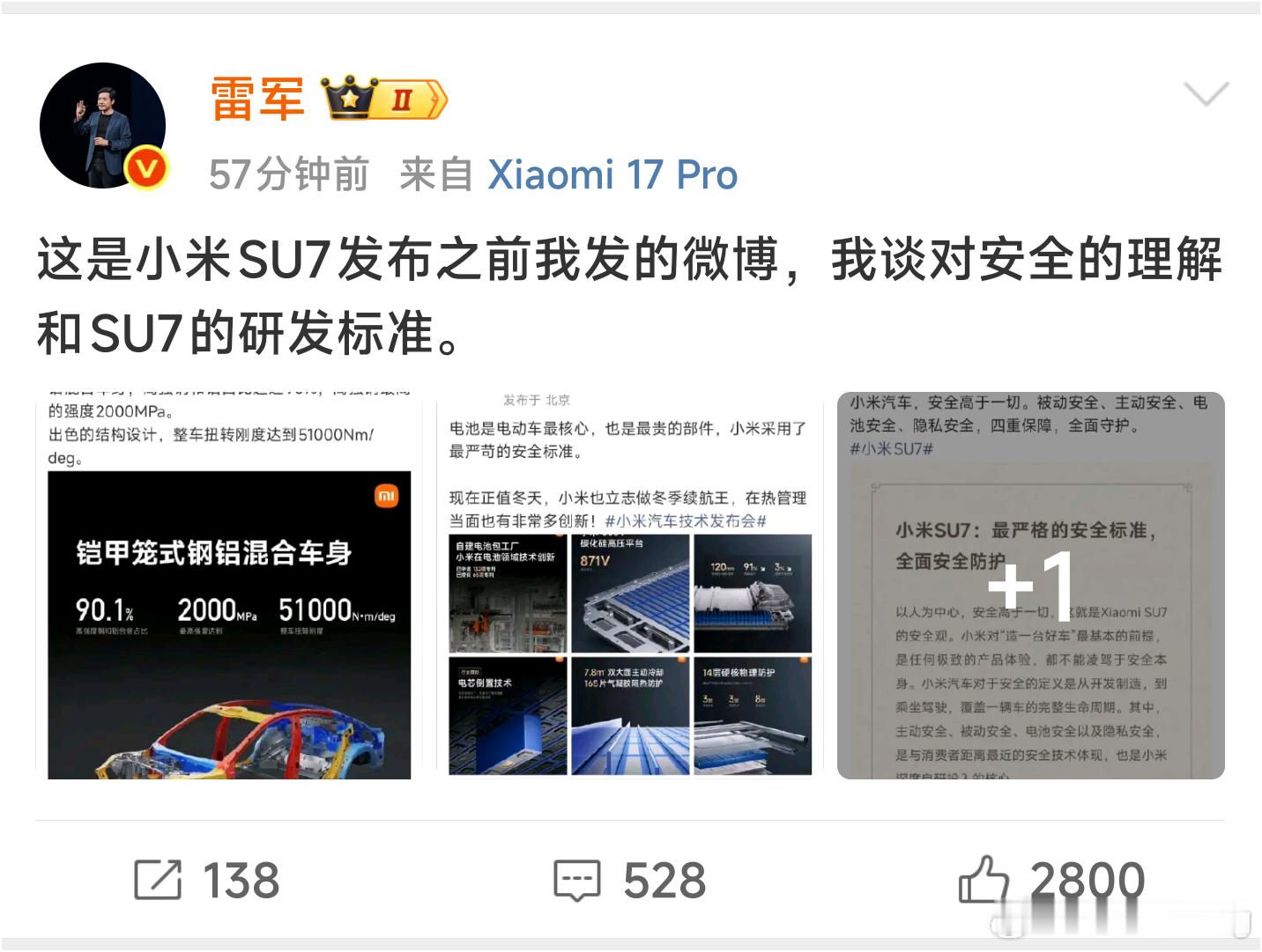 刚刚雷总突然发了两条微博,想说明自己在su7发布前,就特别重视整车的安全。能特别发这两条微博来辟谣,说明雷军或多或少被最近愈发猖獗的造谣攻击影响到一些。或许他本人没受到那么多影响,但身边关心他的人或许也被这些刻意造出来的新闻蒙蔽。其实当前面临这种情况的人很多,特别是和雷军一样,有巨大流量的人,舆论场会天然诞生一股反对谩骂的声音。这种声音或许不是主流,可一旦被某些意外事件点燃,又或者别有用心的人可以引导,就会迅速扩大,占领相当一部分人的心智。其实这几天对雷军的攻击已经没有那么猛烈了,倒是隔壁的影视飓风,被推到风口浪尖上。从我这么多年观察舆论的经验来看,tim那边属于意外,被媒体推波助澜了,而小米这边,因为涉及到商业竞争,又掺杂了不少黑公关的因素。但抛开这一些,近期对公众人物的肆意攻击,其实反应了一个非常危险的信号,那就是现在的舆论对公共讨论的容许范围越来越小。老蒋最新的视频正好说到了这一点,有一些总结还是很有代表性的,主要有两点,一是现在的舆论,有一股不好的风气,将原本“能力越大,责任越大”的要求,微妙的扭曲成“能力越大,受苦越大”,对小米来说,就是经典的“谁叫你流量大”。二是过去的言论,因为社会观念的变化,被挖出来做重新解读,脱离当年的语境,变成另外一种意思。这两点已经是相对比较天然的声音了,更不用说还有很多黑公关刻意的造谣,这些声音对小米也好,对整个社会也好,影响都是非常大的。大家都想要明星,企业家有活人感,而当这些公众人物真成为活人了,舆论又会对这些活人身上的漏洞,进行无孔不入的攻击,非常矛盾。在这种背景下,公众人物逐渐退出社会讨论已成趋势,既然多说多错,那大家干脆就闭嘴不说话,于是社会的舆论空间,就渐渐转向空洞化,大家每天讨论着抽象又无意义的话题,只宣泄情绪,不产生价值,这真的是大家想要的吗?如果不是的话,那就请大家少信谣言,多点思考,多为事实,为正义发声吧。