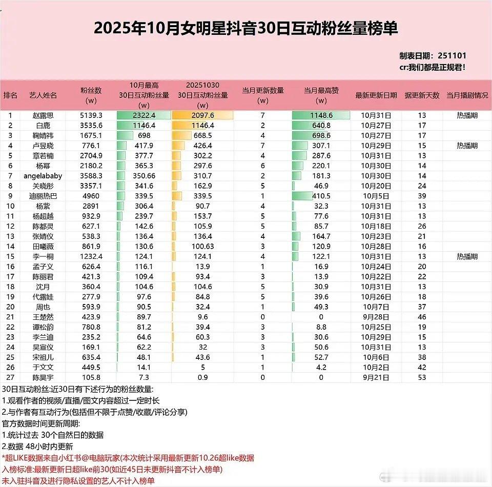 10月抖音互动粉丝量榜单女明星前三是赵露思、白鹿和鞠婧祎