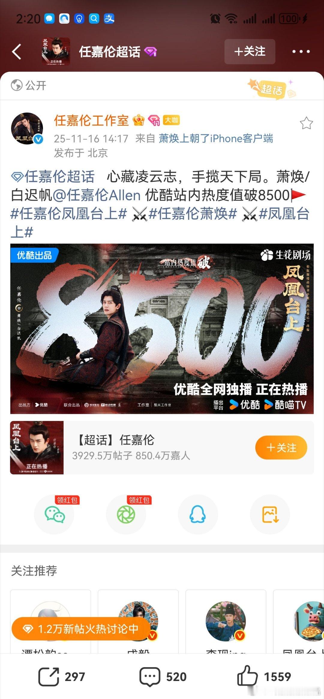凤凰台上热度破8500的海报还是任嘉伦工作室做的。