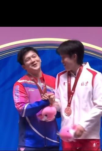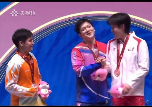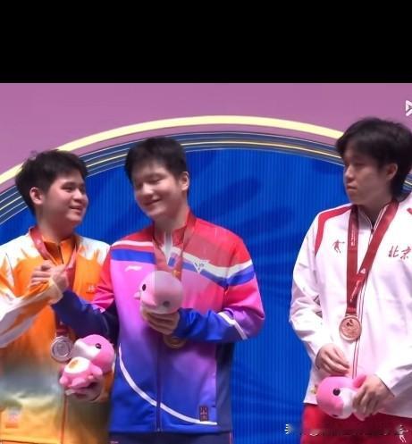 樊振东成大哥,哄完小石头哄大头。 在全运会颁奖礼上,小石头林诗栋主动和樊振东握手,得到樊振东回应后一脸迷弟表情。 看王楚钦站在一边,樊振东马上又和王楚钦握手,生怕冷落了这个弟弟,不知道王楚钦说句了什么,樊振东笑的合不拢嘴。 虽然,在赛场上大家是对手为荣誉而战,但是私下里都是大格局,一团和气。