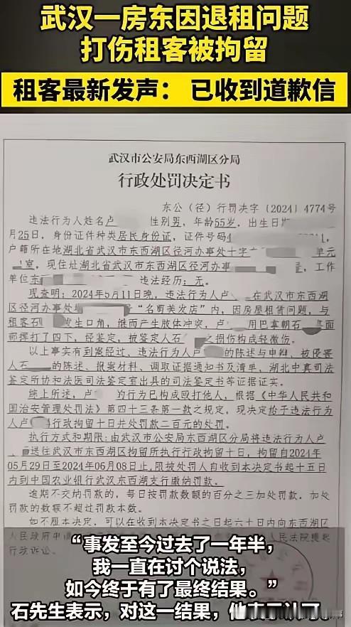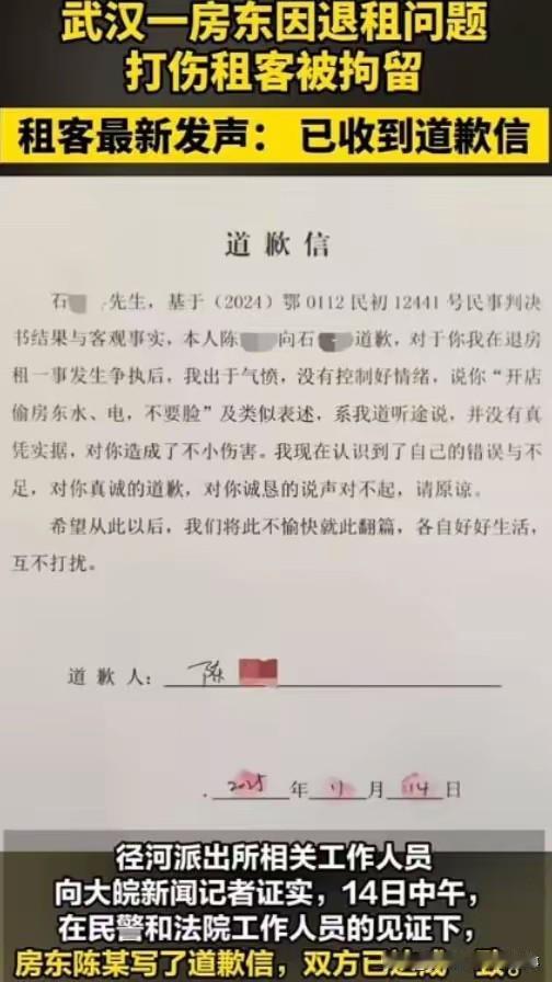 2022年,石先生在武汉市东西湖区租房开美发店,与房东陈某签订3年合同,支付2500元押金,并约定一方提出终止合同需提前1个月告知 。2024年5月,因经营不善,石先生准备退租并提前告知房东 。5月11日,双方当面协商时发生分歧,房东陈某丈夫卢某拒绝退还押金,还动手将石先生打伤,经鉴定石先生为轻微伤,卢某因殴打他人被处行政拘留10日并罚款200元 。 事后,石先生将房东告上法庭 。关于押金问题,一审法院认定石先生违约,需向被告支付2500元违约金,用押金进行抵扣,石先生上诉后,武汉中院二审判决认定他解除合同属于合法解除,判决房东退回2500元押金,赔偿1000元停业损失费 。 此外,石先生以房东侵犯他名誉权以及生命权、身体权、健康权为由提起诉讼,2025年8月,二审判决房东被判赔礼道歉并赔偿医疗费、营养费、误工费等共计数千元 。石先生认为二审判决中未明确房东具体以何种方式道歉,于是向湖北省高级人民法院申请再审,但被驳回 。 2025年11月14日,在法院工作人员和辖区派出所民警见证下,房东陈某向石先生提交书面道歉信,承认辱骂“偷水偷电”等言论系“道听途说无真凭实据”,对石先生造成伤害表示悔过。石先生表示接受道歉,此事就此结束 。东西湖租房 武汉门店出租 云溪美发店 素材来源于网络,侵权删除。