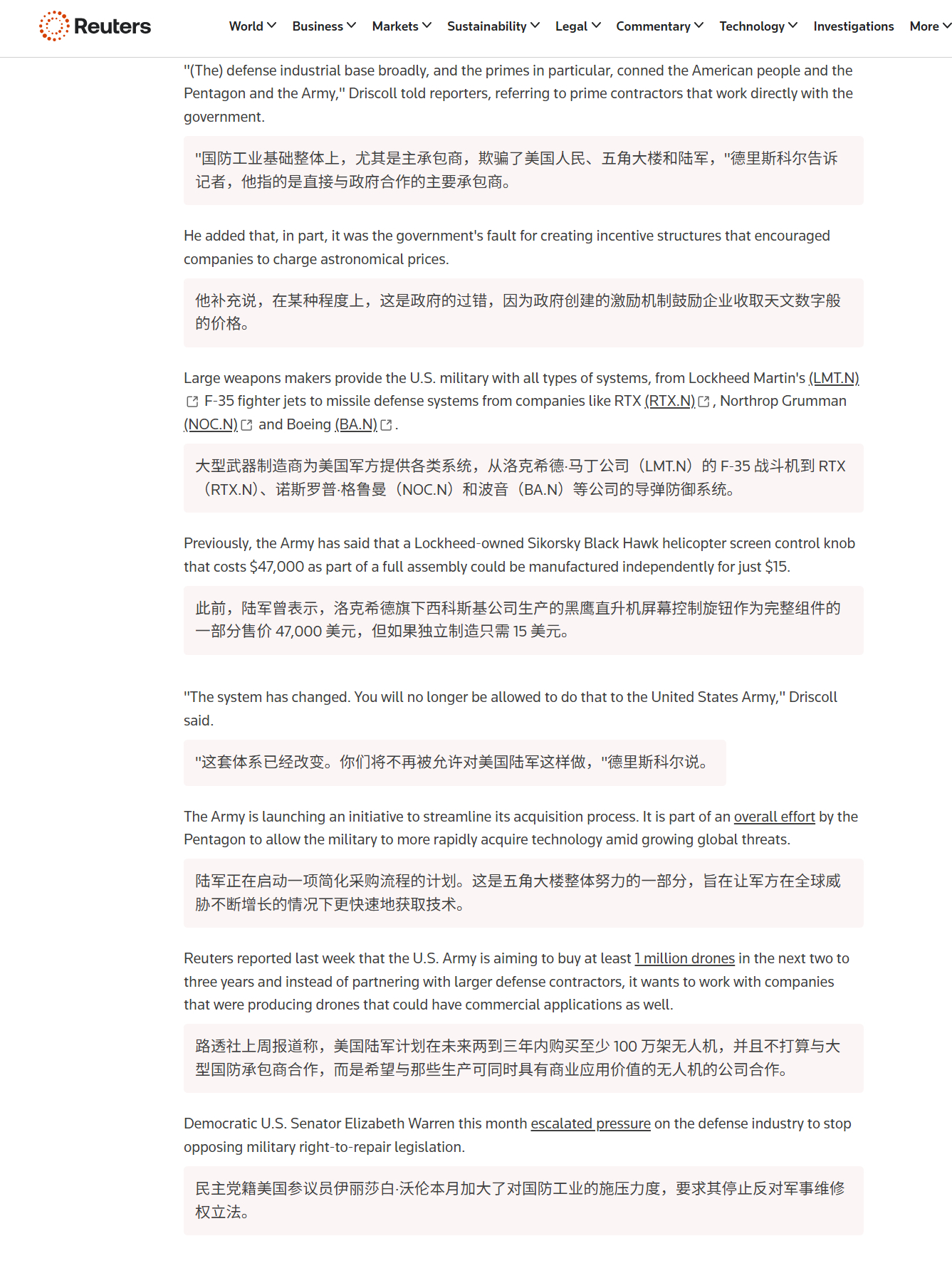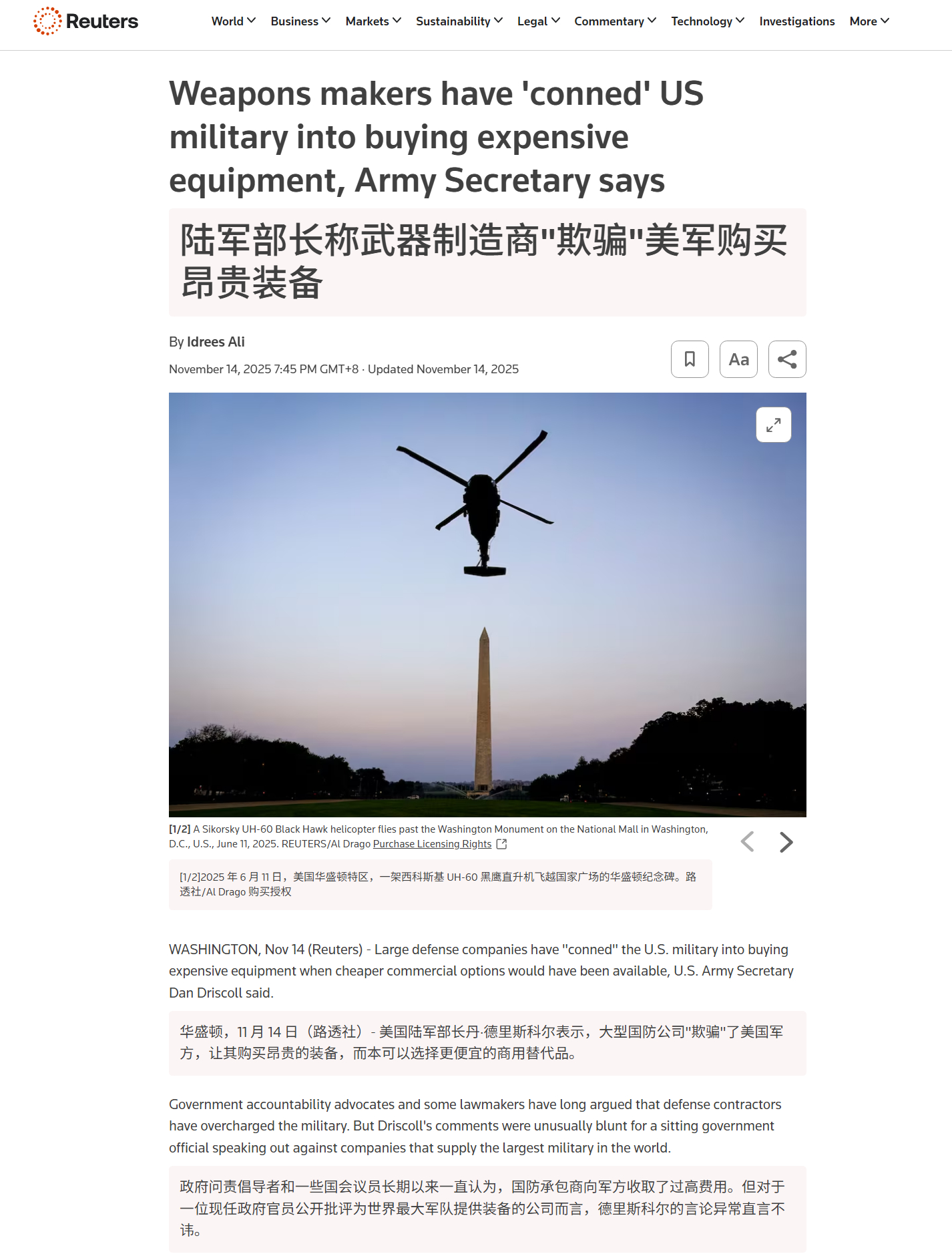 🔻美国陆军部长德中尉称武器制造商"欺骗"美军购买昂贵装备。🔻此前,美国陆军曾表示,洛克希德旗下西科斯基公司生产的黑鹰直升机屏幕控制旋钮,如果独立制造只需 15 美元,但是作为完整组件的一部分卖给美国陆军,售价 47,000 美元。🔻"这套体系已经改变。你们将不再被允许对美国陆军这样做,"德里斯科尔说。🔻路透社报道。
