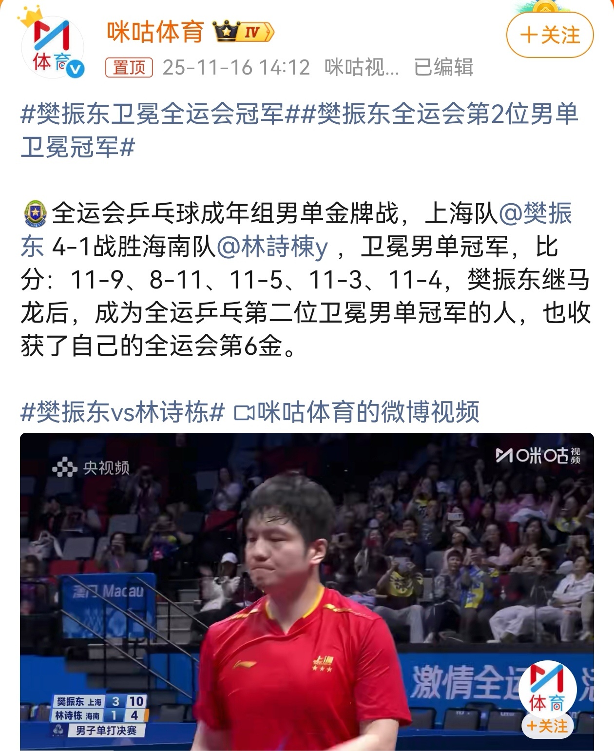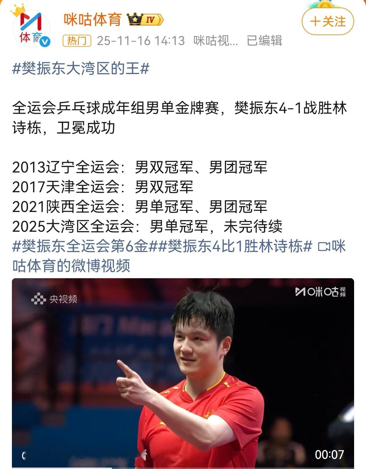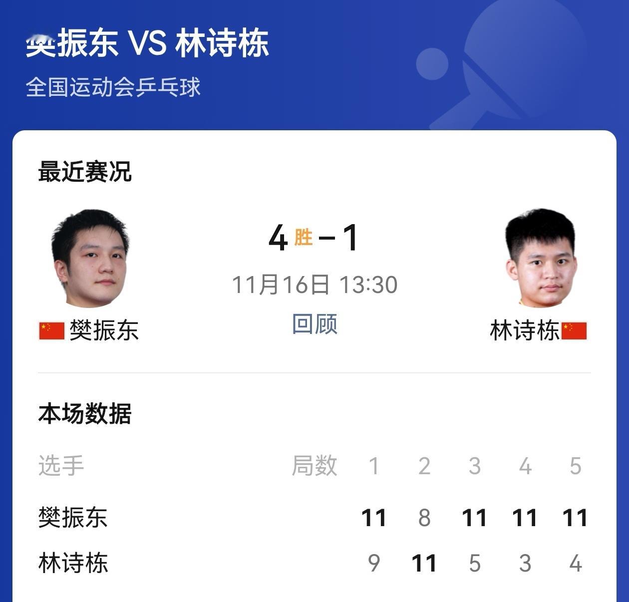 11月16日,第十五届全运会乒乓球男单决赛在澳门银河综艺馆举行,樊振东以4∶1战胜林诗栋,成功卫冕全运会男单冠军。这是樊振东第四次参加全运会乒乓球比赛,四次全部闯入男单决赛,成为全运会历史上继马龙之后,第二位在男单项目上实现卫冕的选手。在我看来,樊振东冠军实至名归。此前的半决赛中,樊振东4:2力克王楚钦,林诗栋则以4:1战胜袁励岑,首次晋级全运会男单决赛。对手的强劲表现,更凸显出樊振东的实力。截至目前,樊振东与王楚钦共交手33次,其中樊振东取得26胜,王楚钦获得7胜。而樊振东与林诗栋共交手15次,樊振东13胜2负占据绝对优势,并一度对林诗栋取得过8连胜。回顾本届全运会乒乓球男单决赛,尽管林诗栋开局状态火热,一度比分大幅领先,但樊振东依旧保持着稳定心态,在关键分的把握上明显更胜一筹,以11-9逆转拿下首局。后续几局比赛,林诗栋虽奋力反击,但在关键分的处理上略显急躁,失误增多。值得一提的是,在赛前训练馆里,樊振东曾主动陪林诗栋练球,19岁的林诗栋虽然未能夺冠,但首次参加全运会便闯入决赛,未来可期,或将能扛起国乒男团的大旗。