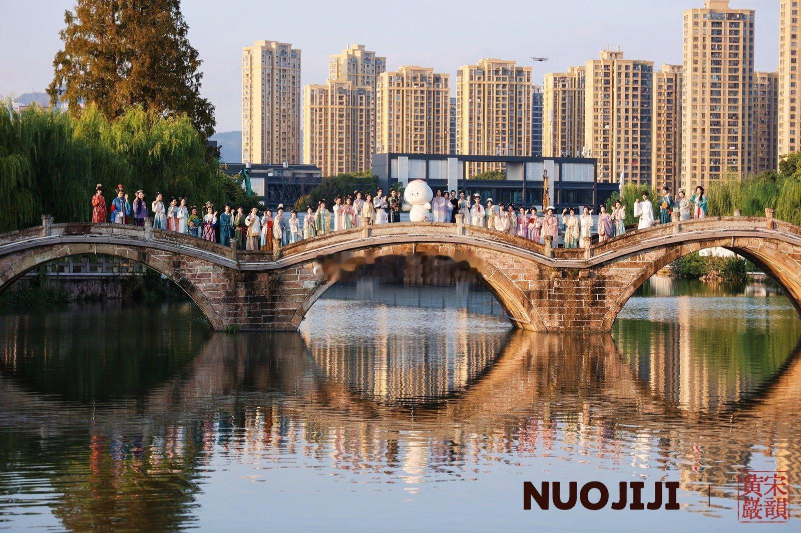 黄岩五洞桥这波古风与萌系的碰撞太绝了!百年古桥边,百人宋服队伍衣袂翻飞,青石板路