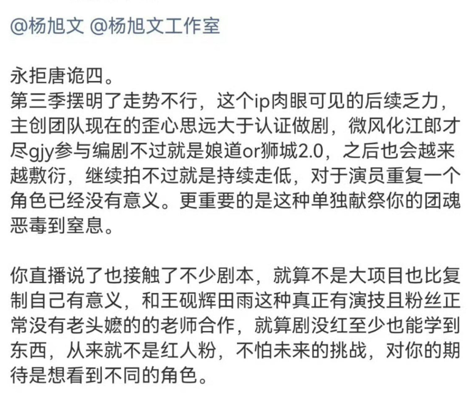 杨旭文目前出圈的作品就只有唐诡吧,爆剧不爆人,粉丝体量达不到流量生的标准,单扛能力很差,没有唐诡系列查无此人了,粉丝别永拒了。