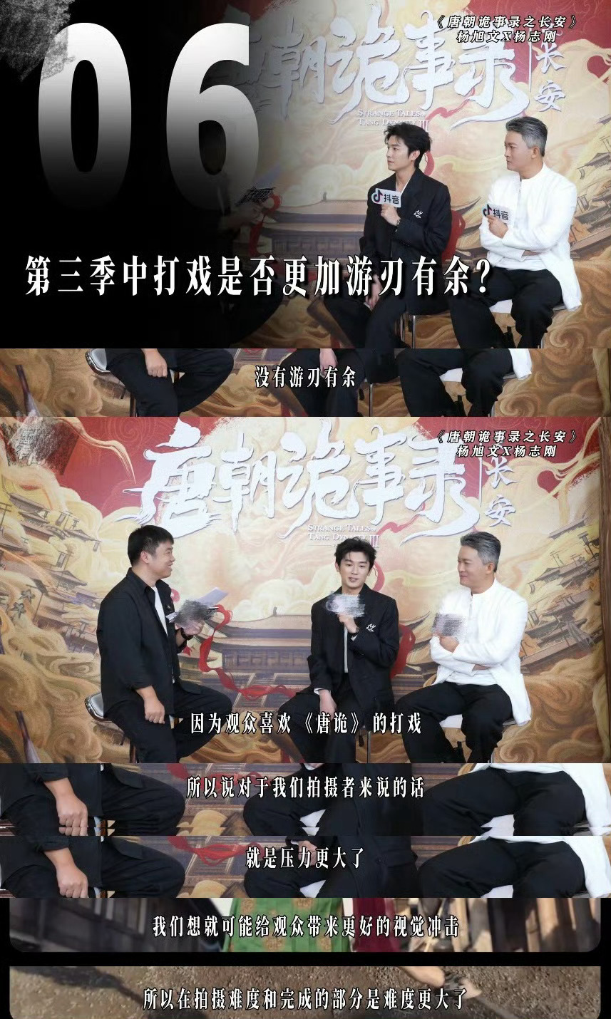 看得出来大家是真的喜欢杨旭文的打戏了,采访主持人说网友想看到唐诡一直拍,那么我们的武担杨旭文到了80岁还得打哈哈哈哈,看给我们唐犟宗吓得,表情包都要出来了。其实采访也聊的虽然杨旭文打了这么多季,但并没有更游刃有余,因为每一季都在增加难度,不过为了观众的期待,咬牙就是干。