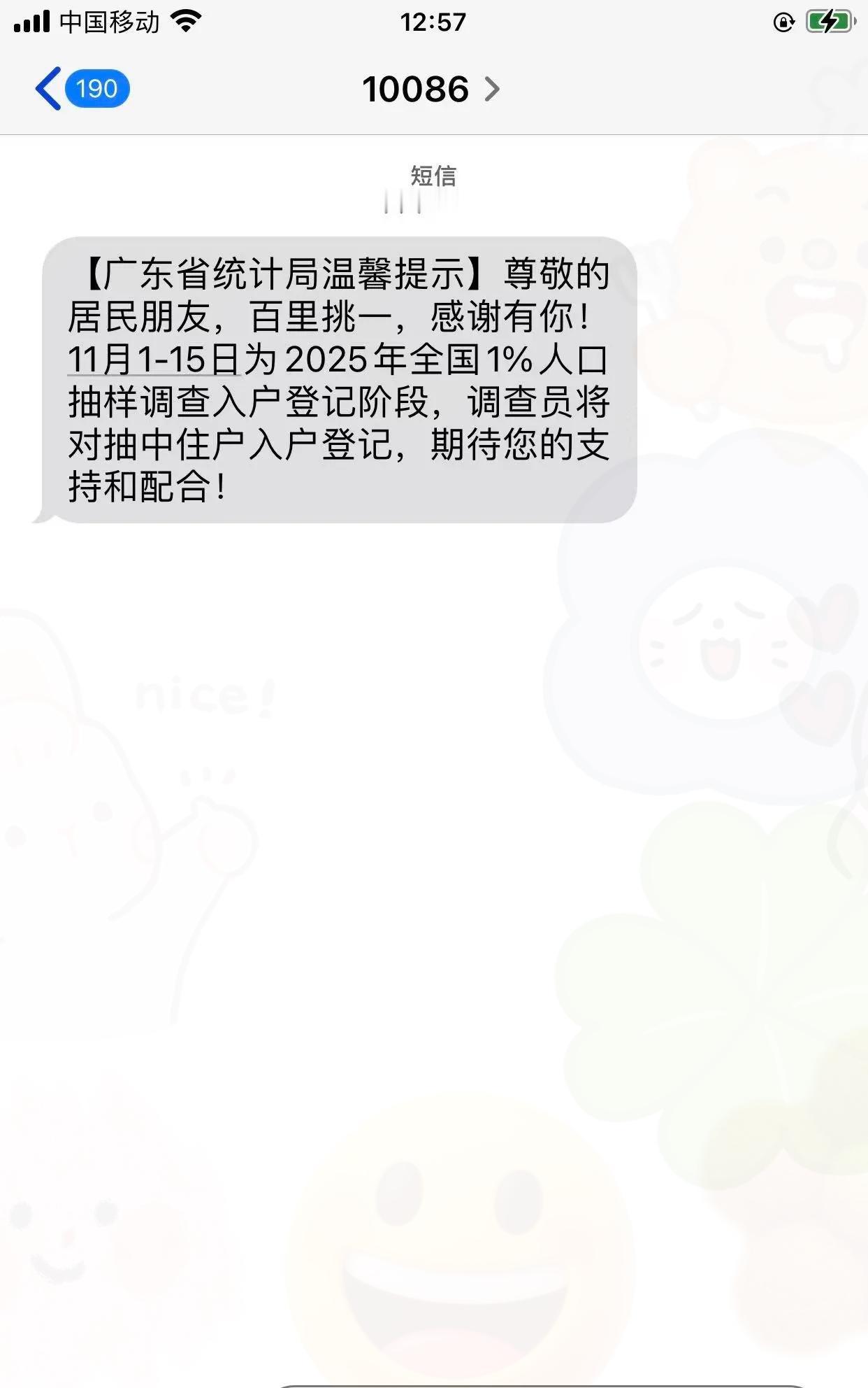 广东的朋友注意啦!最近是不是好多人收到10086发来的“百里挑一”短信?刚开始我还以为是诈骗,仔细一看才知道是广东省统计局的公益提示,2025年全国1%人口抽样调查11月1-15日正在入户登记呢! 千万别觉得这事儿和自己没关系,这可不是简单的填表,而是咱们给生活“提需求”的好机会。你家附近学校够不够、养老设施全不全、就业机会多不多,这些民生大事的政策调整,全靠这1%的样本数据当依据。而且收到短信不代表被抽中,真被选中了会有持证调查员上门,个人信息也会严格保密,完全不用慌。 我觉得这“百里挑一”不是幸运,而是责任,每一次如实填报都是在为自己的生活品质投票。你们都收到这条短信了吗?如果被抽中会积极配合吗?来评论区聊聊~
